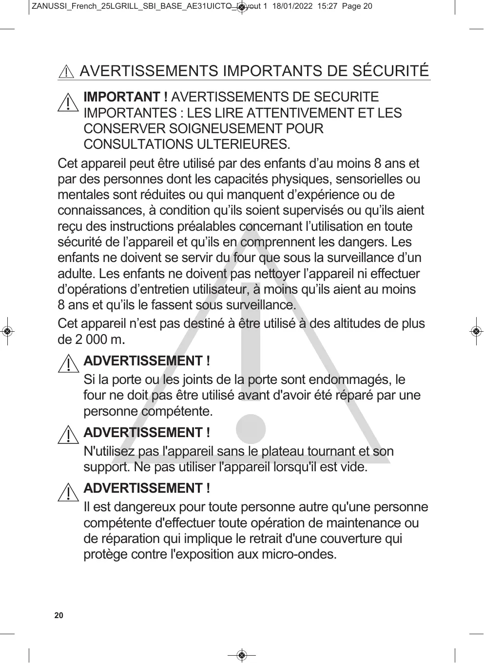 ZANUSSI_French_25LGRILL_SBI_BASE_AE31UICTO_Layout 1 18/01/2022 15:27 Page 20 Avertissements importAnts de sécurité IMPORTANT ! Avertissements de securite importAntes : les lire Attentivement et les conserver soiGneusement pour consultAtions ulterieures. cet appareil peut être utilisé par des enfants d’au moins 8 ans et par des personnes dont les capacités physiques, sensorielles ou mentales sont réduites ou qui manquent d’expérience ou de connaissances, à condition qu’ils soient supervisés ou qu’ils aient reçu des instructions préalables concernant l’utilisation en toute sécurité de l’appareil et qu’ils en comprennent les dangers. les enfants ne doivent se servir du four que sous la surveillance d’un adulte. les enfants ne doivent pas nettoyer l’appareil ni effectuer d’opérations d’entretien utilisateur, à moins qu’ils aient au moins 8 ans et qu’ils le fassent sous surveillance. cet appareil n’est pas destiné à être utilisé à des altitudes de plus de 2 000 m. ADVERTISSEMENT ! si la porte ou les joints de la porte sont endommagés, le four ne doit pas être utilisé avant d'avoir été réparé par une personne compétente. ADVERTISSEMENT ! n'utilisez pas l'appareil sans le plateau tournant et son support. ne pas utiliser l'appareil lorsqu'il est vide. ADVERTISSEMENT ! il est dangereux pour toute personne autre qu'une personne compétente d'effectuer toute opération de maintenance ou de réparation qui implique le retrait d'une couverture qui protège contre l'exposition aux micro-ondes.