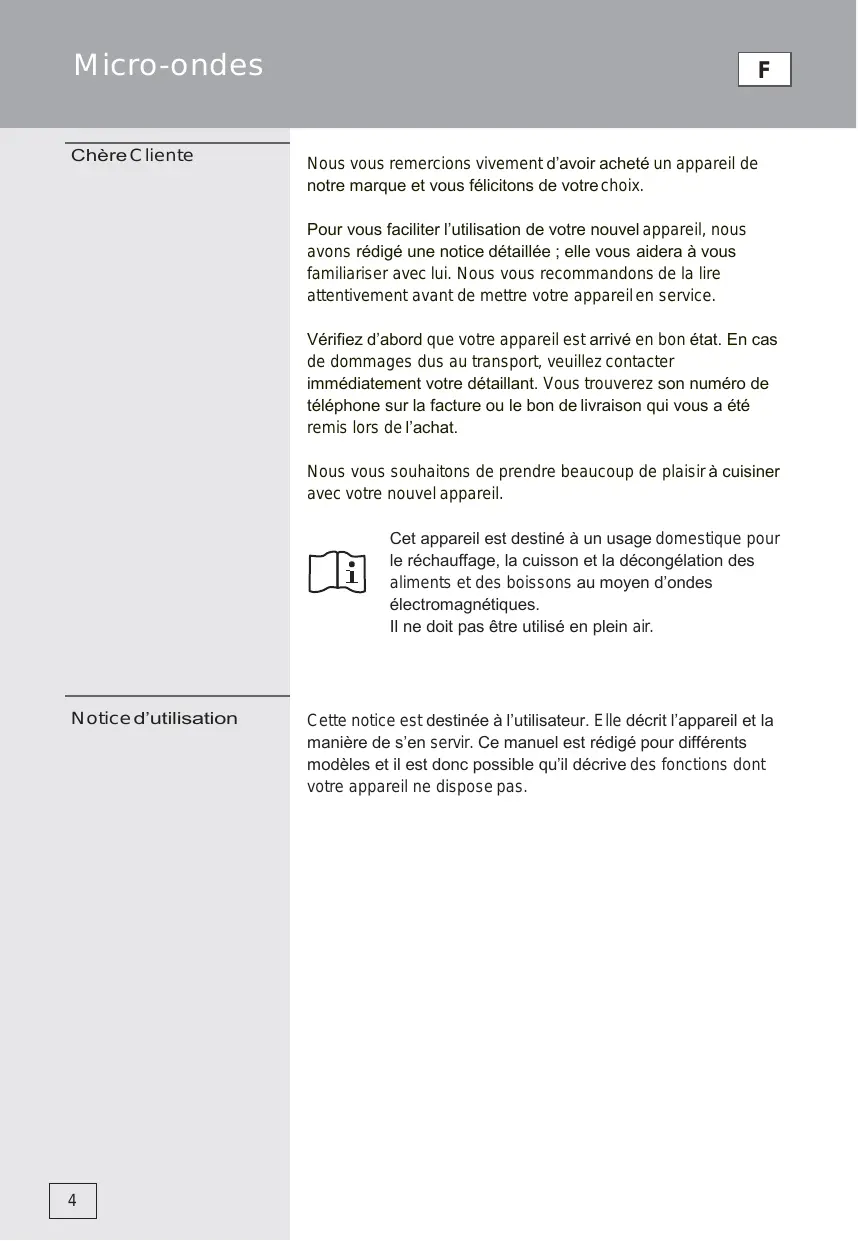 F Nous vous remercions vivement d’avoir acheté un appareil de notre marque et vous félicitons de votre choix. Pour vous faciliter l’utilisation de votre nouvel appareil, nous avons rédigé une notice détaillée ; elle vous aidera à vous familiariser avec lui. Nous vous recommandons de la lire attentivement avant de mettre votre appareil en service. Vérifiez d’abord que votre appareil est arrivé en bon état. En cas de dommages dus au transport, veuillez contacter immédiatement votre détaillant. Vous trouverez son numéro de téléphone sur la facture ou le bon de livraison qui vous a été remis lors de l’achat. Nous vous souhaitons de prendre beaucoup de plaisir à cuisiner avec votre nouvel appareil. Cet appareil est destiné à un usage domestique pour le réchauffage, la cuisson et la décongélation des aliments et des boissons au moyen d’ondes électromagnétiques. Il ne doit pas être utilisé en plein air.
