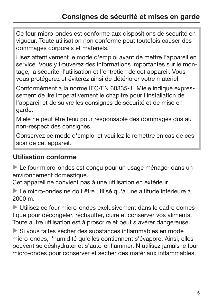 Consignes de sécurité et mises en garde Ce four micro-ondes est conforme aux dispositions de sécurité en vigueur. Toute utilisation non conforme peut toutefois causer des dommages corporels et matériels. Lisez attentivement le mode d'emploi avant de mettre l'appareil en service. Vous y trouverez des informations importantes sur le montage, la sécurité, l'utilisation et l'entretien de cet appareil. Vous vous protégerez et éviterez ainsi de détériorer votre matériel. Conformément à la norme IEC/EN 60335-1, Miele indique expressément de lire impérativement le chapitre pour l'installation de l'appareil et de suivre les consignes de sécurité et de mise en garde. Miele ne peut être tenu pour responsable des dommages dus au non-respect des consignes. Conservez ce mode d'emploi et veuillez le remettre en cas de cession de cet appareil.