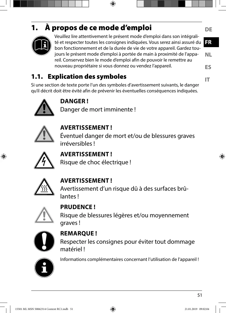 INSTRUCTIONS DE SÉCURITÉ IMPORTANTES – LIRE ATTENTIVEMENT ET CONSERVER POUR TOUTE RÉFÉRENCE ULTÉRIEURE ! AVERTISSEMENT ! Risque de blessure ! Il existe un risque de blessure pour les personnes à capacités physiques, sensorielles ou mentales restreintes (par exemple personnes partiellement handicapées, personnes âgées avec diminution de leurs capacités physiques et mentales) ou manquant d’expériences et/ ou de connaissances (par exemple enfants plus âgés). 53 15501 ML MSN 50062314 Content RC1.indb 53