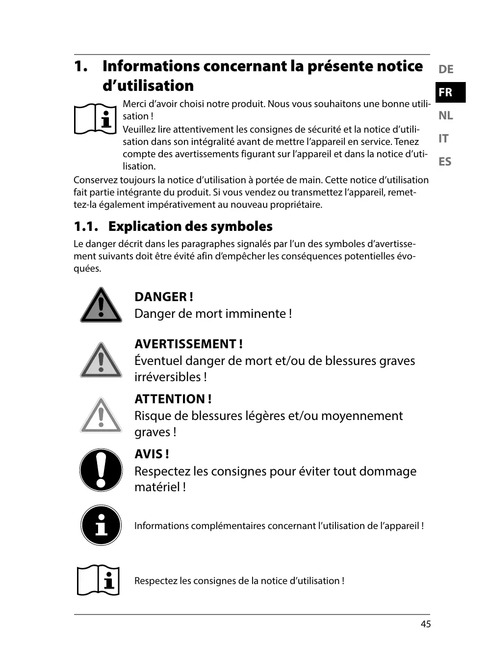Danger de mort imminente ! AVERTISSEMENT ! Éventuel danger de mort et/ou de blessures graves irréversibles ! ATTENTION ! Risque de blessures légères et/ou moyennement graves ! AVIS ! Respectez les consignes pour éviter tout dommage matériel ! Informations complémentaires concernant l’utilisation de l’appareil !