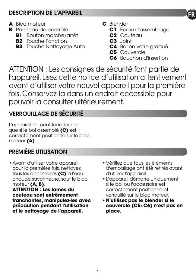 VERROUILLAGE DE SÉCURITÉ L'appareil ne peut fonctionner que si le bol assemblé (C) est correctement positionné sur le bloc moteur (A).