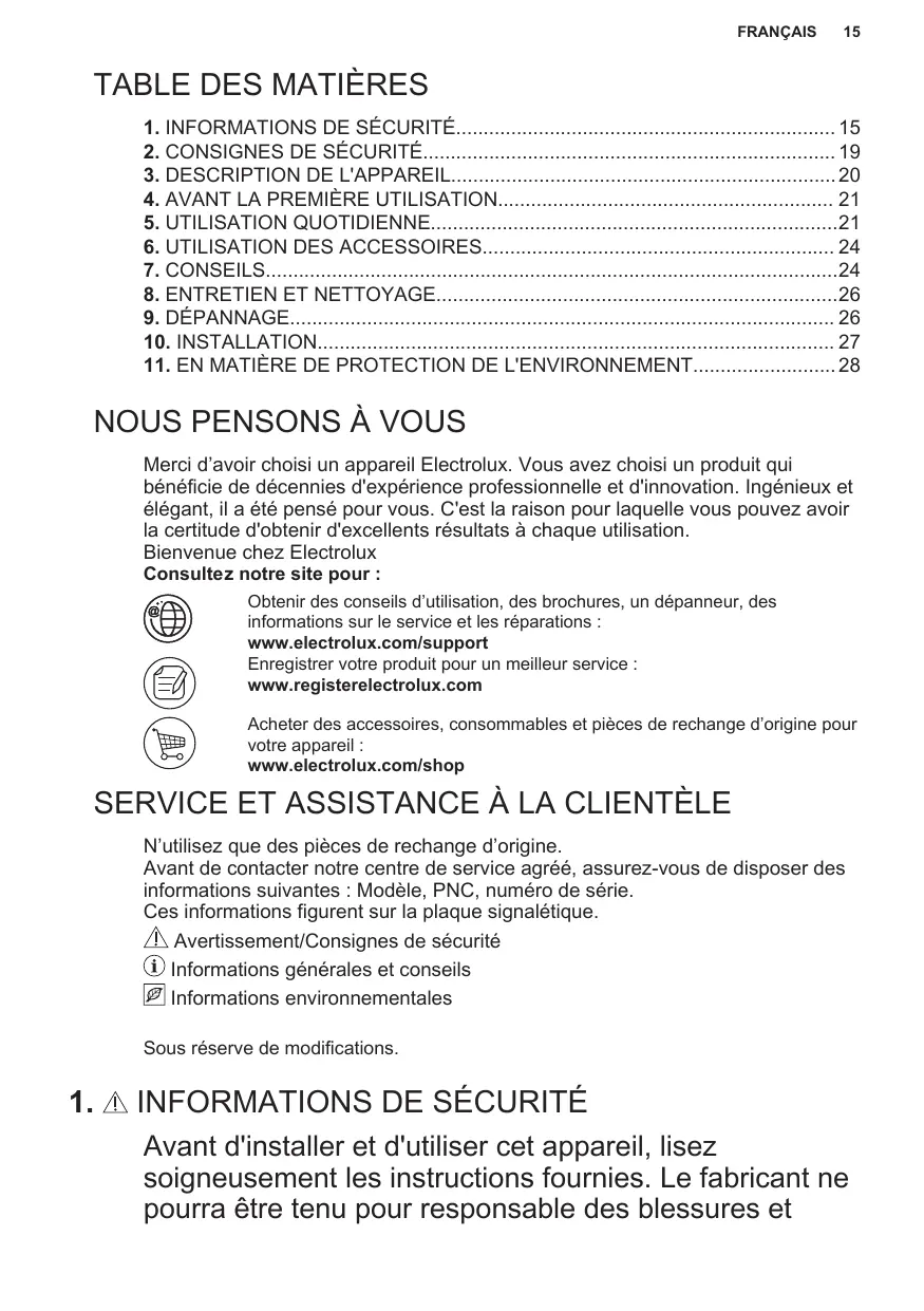 Merci d’avoir choisi un appareil Electrolux. Vous avez choisi un produit qui bénéficie de décennies d'expérience professionnelle et d'innovation. Ingénieux et élégant, il a été pensé pour vous. C'est la raison pour laquelle vous pouvez avoir la certitude d'obtenir d'excellents résultats à chaque utilisation. Bienvenue chez Electrolux Consultez notre site pour : Obtenir des conseils d’utilisation, des brochures, un dépanneur, des informations sur le service et les réparations : www.electrolux.com/support Enregistrer votre produit pour un meilleur service : www.registerelectrolux.com Acheter des accessoires, consommables et pièces de rechange d’origine pour votre appareil : www.electrolux.com/shop