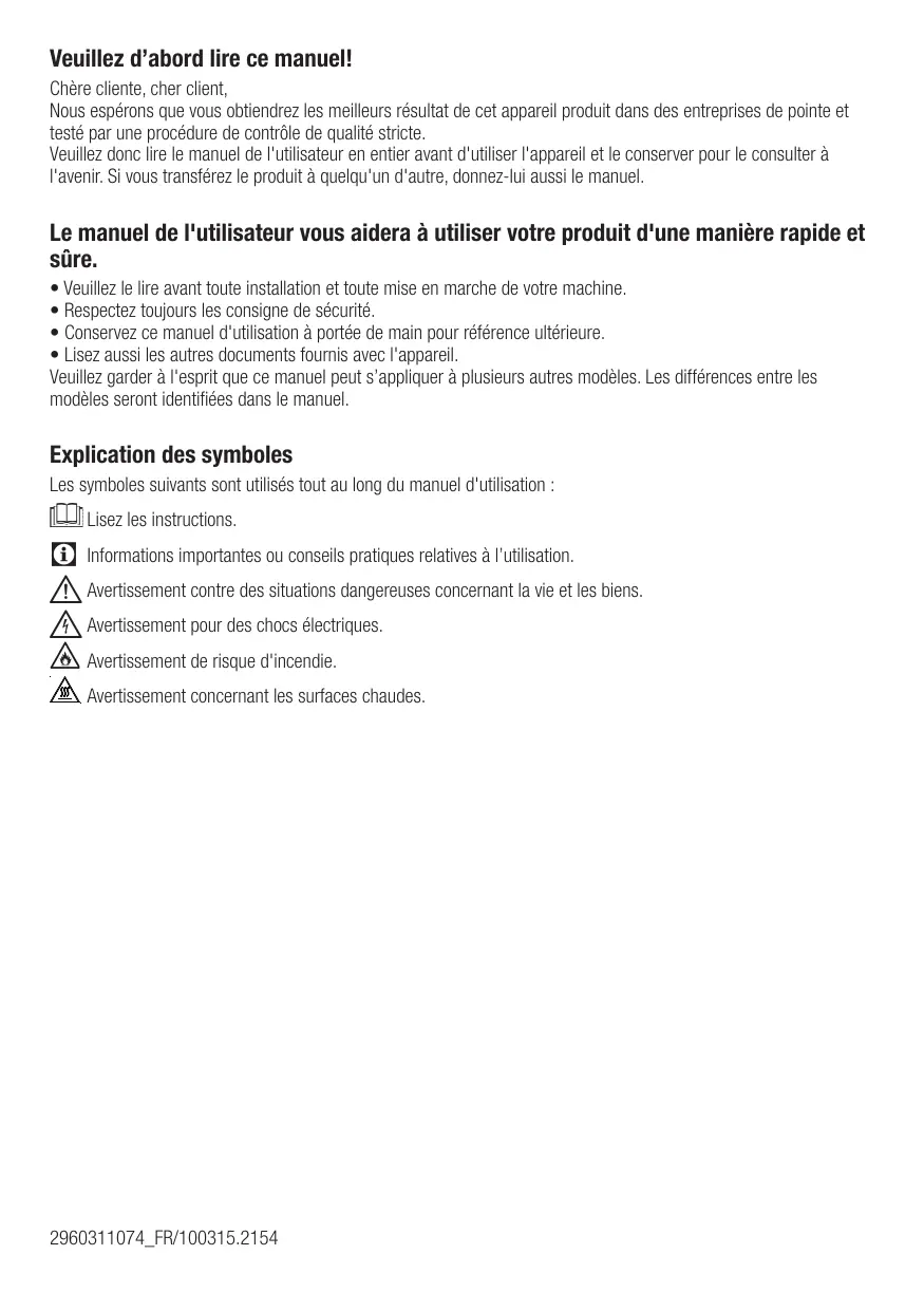 - Lisez aussi les autres documents fournis avec l'appareil. Veuillez garder à l'esprit que ce manuel peut s’appliquer à plusieurs autres modèles. Les différences entre les modèles seront identifiées dans le manuel. Explication des symboles Les symboles suivants sont utilisés tout au long du manuel d'utilisation : Lisez les instructions. C Informations importantes ou conseils pratiques relatives à l’utilisation. A Avertissement contre des situations dangereuses concernant la vie et les biens. B Avertissement pour des chocs électriques. Avertissement de risque d'incendie. Avertissement concernant les surfaces chaudes. 2960311074_FR/100315.2154 1 Consignes de sécurité importantes Cette section comprend des consignes de sécurité qui vous aideront à vous protéger contre les risques de blessures corporelles ou de dégâts matériels. Le non respect de ces consignes annulera toute garantie. Sécurité générale