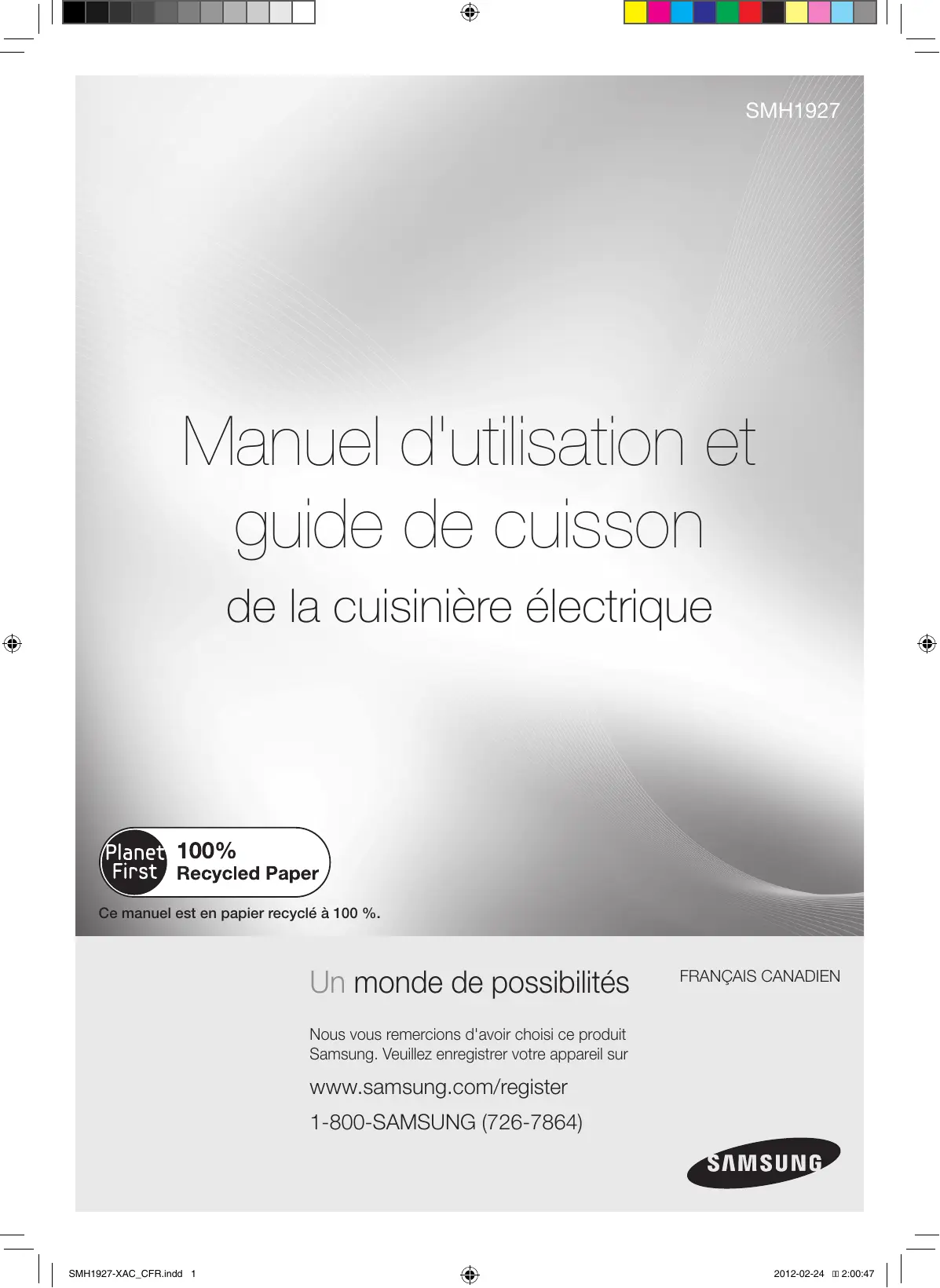 Nous vous remercions d'avoir choisi ce produit Samsung. Veuillez enregistrer votre appareil sur www.samsung.com/register 1-800-SAMSUNG (726-7864) SMH1927-XAC_CFR.indd 1 2012-02-24 2:00:47 consignes de sécurité Félicitations pour l'acquisition de votre nouveau four à micro-ondes Samsung. Ce manuel contient des informations importantes concernant l'installation, l'utilisation et l'entretien de votre appareil. Veuillez le lire attentivement afin de profiter pleinement des nombreux avantages et fonctions qu'offre votre four micro-ondes. Ce que vous devez savoir sur les consignes de sécurité Les avertissements et les consignes de sécurité importantes contenus dans ce manuel ne sont pas exhaustifs. Il est de votre responsabilité de faire appel à votre bon sens et de faire preuve de prudence et de minutie lors de l'installation, de l'entretien et de l'utilisation du four micro-ondes. CONSIGNES PERMETTANT