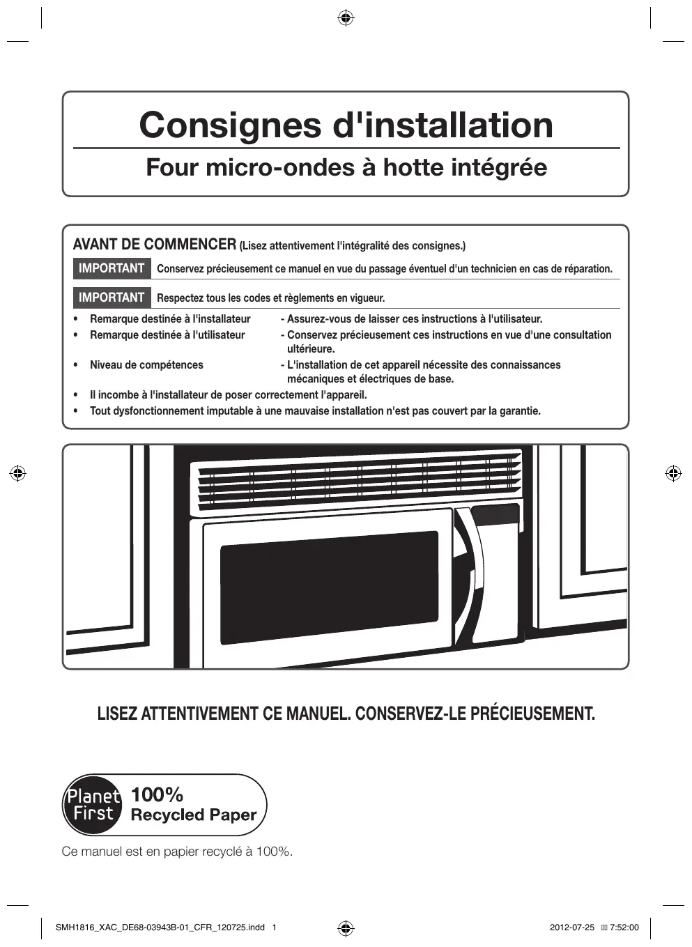 Consignes d'installation Four micro-ondes à hotte intégrée AVANT DE COMMENCER (Lisez attentivement l'intégralité des consignes.) IMPORTANT Conservez précieusement ce manuel en vue du passage éventuel d'un technicien en cas de réparation. IMPORTANT Respectez tous les codes et règlements en vigueur. • • • • •