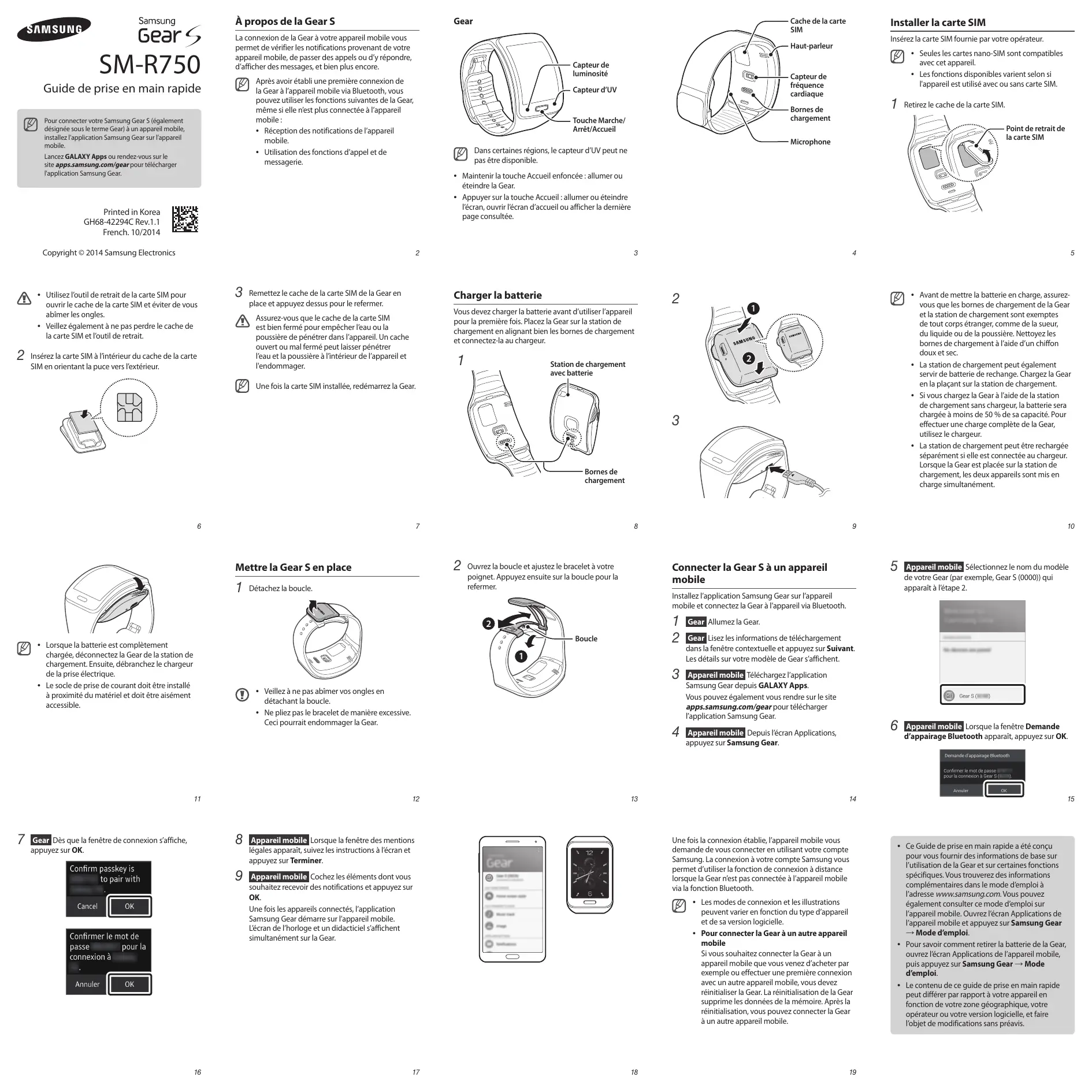 - Utilisation des fonctions d’appel et de messagerie. Guide de prise en main rapide Installer la carte SIM Cache de la carte SIM Les modes de connexion et les illustrations peuvent varier en fonction du type d’appareil et de sa version logicielle. Pour connecter la Gear à un autre appareil mobile Si vous souhaitez connecter la Gear à un appareil mobile que vous venez d’acheter par exemple ou effectuer une première connexion avec un autre appareil mobile, vous devez réinitialiser la Gear. La réinitialisation de la Gear supprime les données de la mémoire. Après la réinitialisation, vous pouvez connecter la Gear à un autre appareil mobile.