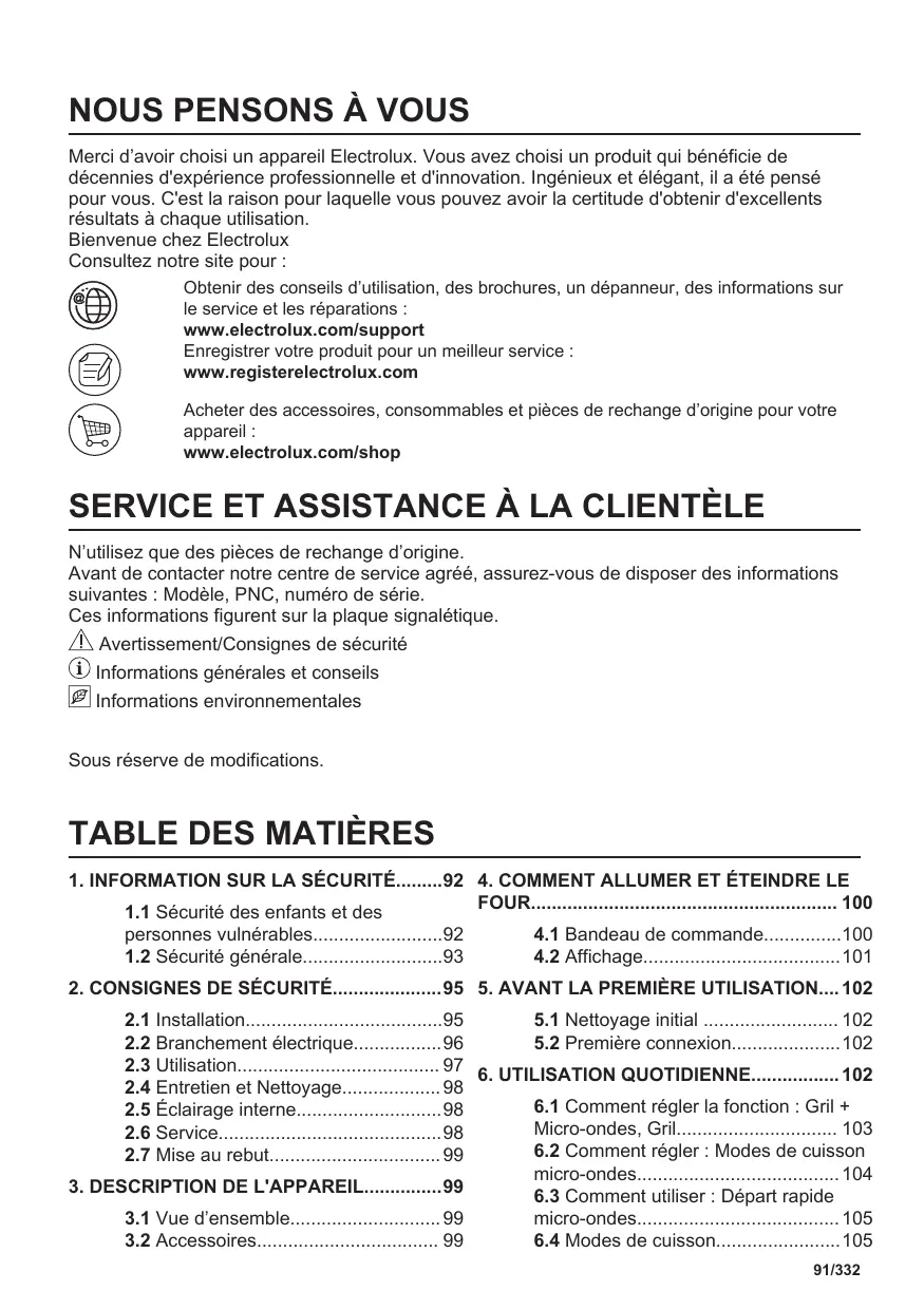 Merci d’avoir choisi un appareil Electrolux. Vous avez choisi un produit qui bénéficie de décennies d'expérience professionnelle et d'innovation. Ingénieux et élégant, il a été pensé pour vous. C'est la raison pour laquelle vous pouvez avoir la certitude d'obtenir d'excellents résultats à chaque utilisation. Bienvenue chez Electrolux Consultez notre site pour : Obtenir des conseils d’utilisation, des brochures, un dépanneur, des informations sur le service et les réparations : www.electrolux.com/support Enregistrer votre produit pour un meilleur service : www.registerelectrolux.com Acheter des accessoires, consommables et pièces de rechange d’origine pour votre appareil : www.electrolux.com/shop
