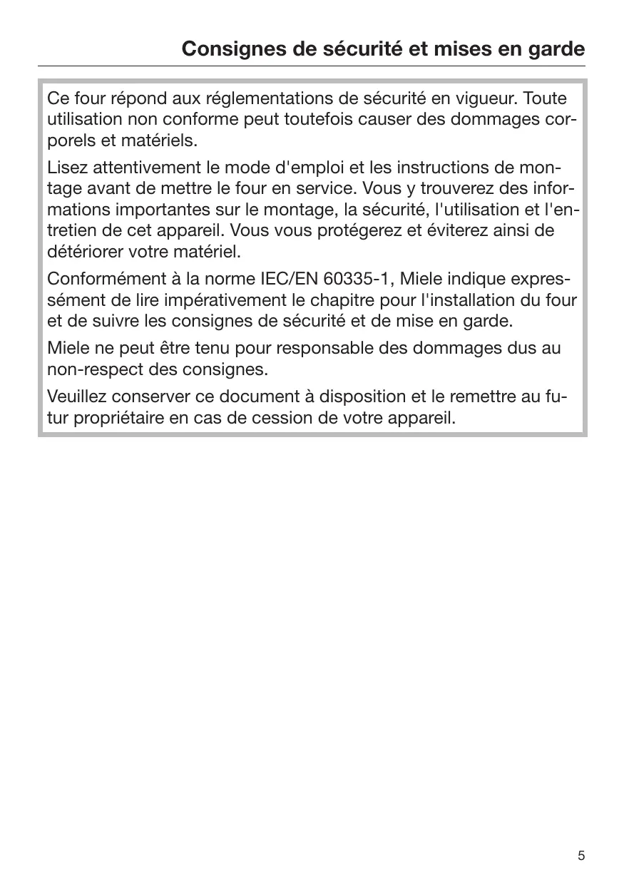 Consignes de sécurité et mises en garde Ce four répond aux réglementations de sécurité en vigueur. Toute utilisation non conforme peut toutefois causer des dommages corporels et matériels. Lisez attentivement le mode d'emploi et les instructions de montage avant de mettre le four en service. Vous y trouverez des informations importantes sur le montage, la sécurité, l'utilisation et l'entretien de cet appareil. Vous vous protégerez et éviterez ainsi de détériorer votre matériel. Conformément à la norme IEC/EN 60335-1, Miele indique expressément de lire impérativement le chapitre pour l'installation du four et de suivre les consignes de sécurité et de mise en garde. Miele ne peut être tenu pour responsable des dommages dus au non-respect des consignes. Veuillez conserver ce document à disposition et le remettre au futur propriétaire en cas de cession de votre appareil.