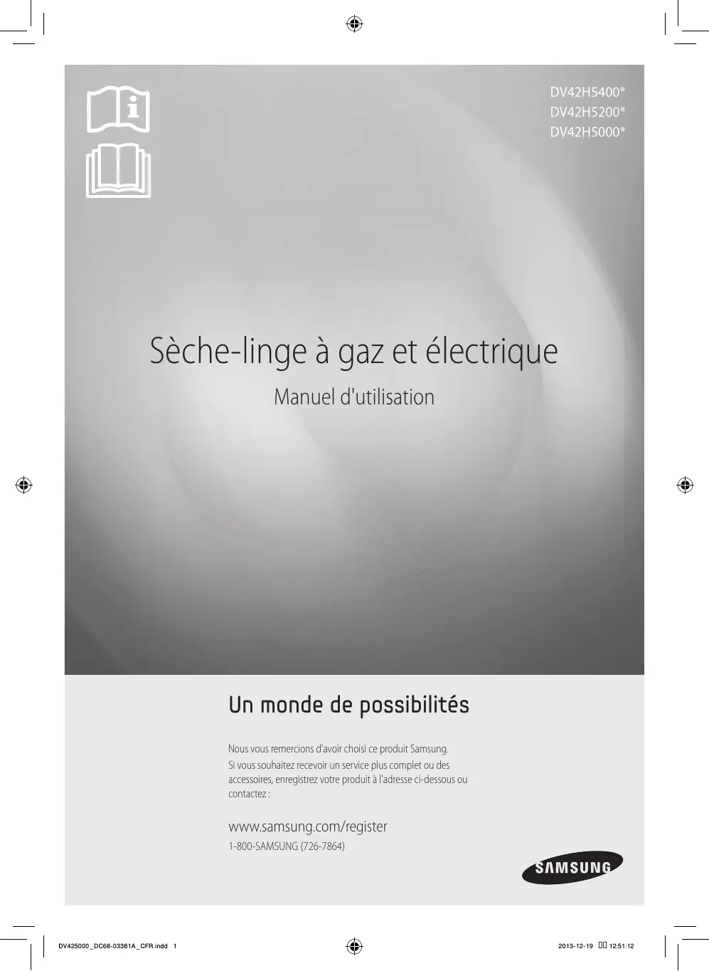 DV425000_DC68-03381A.indd 44 2013-12-19 1:07:17 DV42H5400* DV42H5200* DV42H5000* Sèche-linge à gaz et électrique Manuel d'utilisation Un monde de possibilités Nous vous remercions d'avoir choisi ce produit Samsung. Si vous souhaitez recevoir un service plus complet ou des accessoires, enregistrez votre produit à l'adresse ci-dessous ou contactez : www.samsung.com/register 1-800-SAMSUNG (726-7864) DV425000_DC68-03381A_CFR.indd 1 2013-12-19 12:51:12 Sommaire