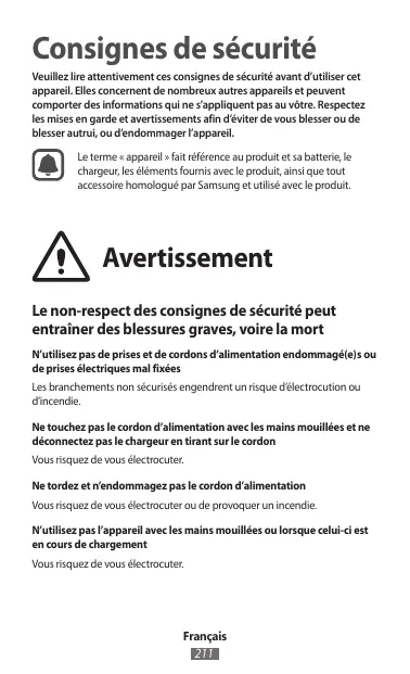 Consignes de sécurité Veuillez lire attentivement ces consignes de sécurité avant d’utiliser cet appareil. Elles concernent de nombreux autres appareils et peuvent comporter des informations qui ne s’appliquent pas au vôtre. Respectez les mises en garde et avertissements afin d’éviter de vous blesser ou de blesser autrui, ou d’endommager l’appareil. Le terme « appareil » fait référence au produit et sa batterie, le chargeur, les éléments fournis avec le produit, ainsi que tout accessoire homologué par Samsung et utilisé avec le produit.