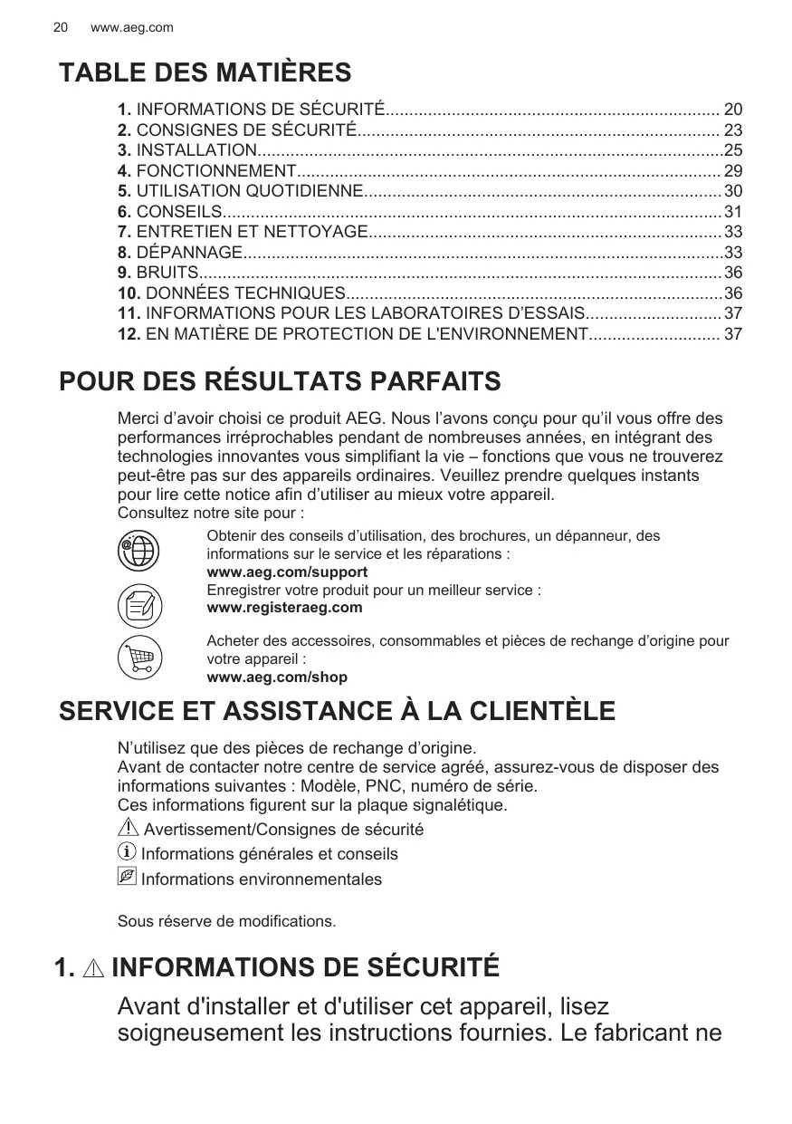 Merci d’avoir choisi ce produit AEG. Nous l’avons conçu pour qu’il vous offre des performances irréprochables pendant de nombreuses années, en intégrant des technologies innovantes vous simplifiant la vie – fonctions que vous ne trouverez peut-être pas sur des appareils ordinaires. Veuillez prendre quelques instants pour lire cette notice afin d’utiliser au mieux votre appareil. Consultez notre site pour : Obtenir des conseils d’utilisation, des brochures, un dépanneur, des informations sur le service et les réparations : www.aeg.com/support Enregistrer votre produit pour un meilleur service : www.registeraeg.com Acheter des accessoires, consommables et pièces de rechange d’origine pour votre appareil : www.aeg.com/shop