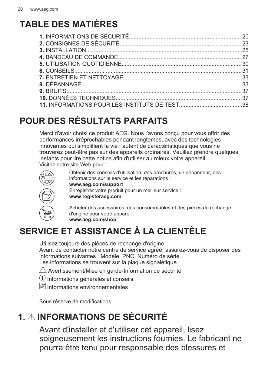 Merci d'avoir choisi ce produit AEG. Nous l'avons conçu pour vous offrir des performances irréprochables pendant longtemps, avec des technologies innovantes qui simplifient la vie : autant de caractéristiques que vous ne trouverez peut-être pas sur des appareils ordinaires. Veuillez prendre quelques instants pour lire cette notice afin d'utiliser au mieux votre appareil. Visitez notre site Web pour : Obtenir des conseils d'utilisation, des brochures, un dépanneur, des informations sur le service et les réparations : www.aeg.com/support Enregistrer votre produit pour un meilleur service : www.registeraeg.com Acheter des accessoires, des consommables et des pièces de rechange d'origine pour votre appareil : www.aeg.com/shop