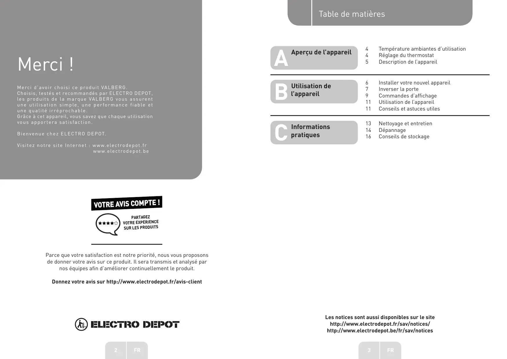 Nettoyage et entretien Dépannage Conseils de stockage Parce que votre satisfaction est notre priorité, nous vous proposons de donner votre avis sur ce produit. Il sera transmis et analysé par nos équipes afin d’améliorer continuellement le produit. Donnez votre avis sur http://www.electrodepot.fr/avis-client Les notices sont aussi disponibles sur le site http://www.electrodepot.fr/sav/notices/ http://www.electrodepot.be/fr/sav/notices