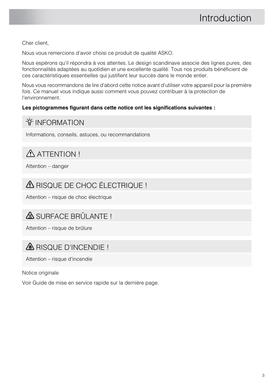 Introduction Cher client, Nous vous remercions d'avoir choisi ce produit de qualité ASKO. Nous espérons qu'il répondra à vos attentes. Le design scandinave associe des lignes pures, des fonctionnalités adaptées au quotidien et une excellente qualité. Tous nos produits bénéficient de ces caractéristiques essentielles qui justifient leur succès dans le monde entier. Nous vous recommandons de lire d'abord cette notice avant d'utiliser votre appareil pour la première fois. Ce manuel vous indique aussi comment vous pouvez contribuer à la protection de l'environnement. Les pictogrammes figurant dans cette notice ont les significations suivantes : INFORMATION Informations, conseils, astuces, ou recommandations ATTENTION ! Attention – danger RISQUE DE CHOC ÉLECTRIQUE ! Attention – risque de choc électrique SURFACE BRÛLANTE ! Attention – risque de brûlure RISQUE D'INCENDIE ! Attention – risque d'incendie Notice originale Voir Guide de mise en service rapide sur la dernière page.