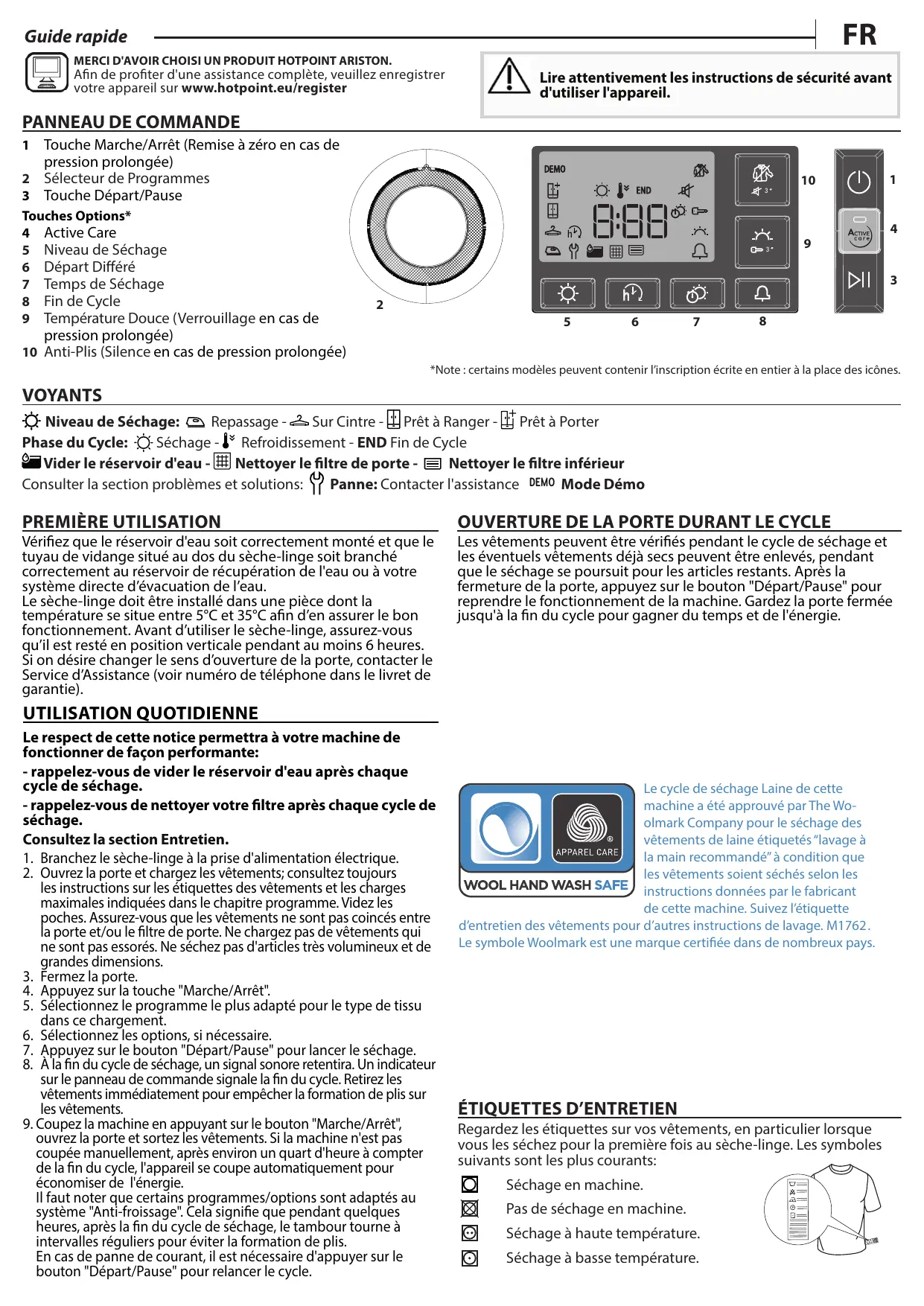 Guide rapide MERCI D'AVOIR CHOISI UN PRODUIT HOTPOINT ARISTON. Afin de profiter d'une assistance complète, veuillez enregistrer votre appareil sur www.hotpoint.eu/register