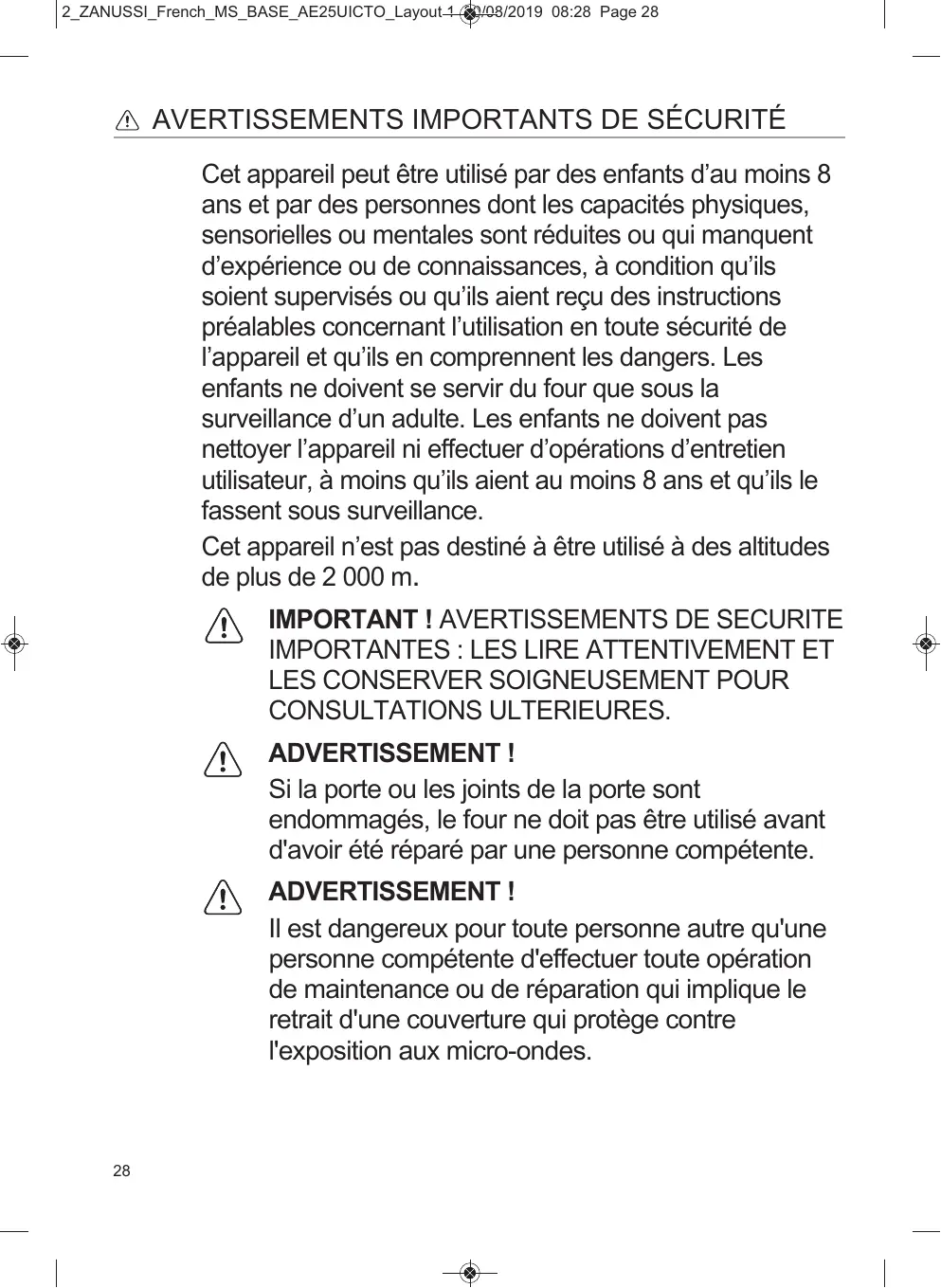 2_ZANUSSI_French_MS_BASE_AE25UICTO_Layout 1 30/08/2019 08:28 Page 28 AVERTISSEMENTS IMPORTANTS DE SécuRITé cet appareil peut être utilisé par des enfants d’au moins 8 ans et par des personnes dont les capacités physiques, sensorielles ou mentales sont réduites ou qui manquent d’expérience ou de connaissances, à condition qu’ils soient supervisés ou qu’ils aient reçu des instructions préalables concernant l’utilisation en toute sécurité de l’appareil et qu’ils en comprennent les dangers. Les enfants ne doivent se servir du four que sous la surveillance d’un adulte. Les enfants ne doivent pas nettoyer l’appareil ni effectuer d’opérations d’entretien utilisateur, à moins qu’ils aient au moins 8 ans et qu’ils le fassent sous surveillance. cet appareil n’est pas destiné à être utilisé à des altitudes de plus de 2 000 m. IMPORTANT ! AVERTISSEMENTS DE SEcuRITE