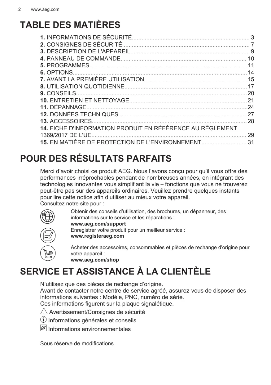 Enregistrer votre produit pour un meilleur service : www.registeraeg.com Acheter des accessoires, consommables et pièces de rechange d’origine pour votre appareil : www.aeg.com/shop