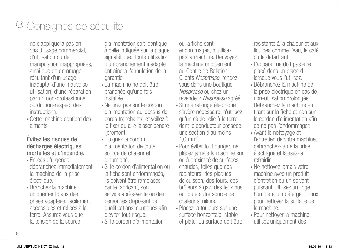 UM_VERTUO NEXT_Z2.indb 8 •• Ne touchez jamais le cordon d’alimentation avec les mains mouillées. •• Ne plongez jamais la machine, en tout ou partie, dans l’eau ou dans d’autres liquides. •• Ne placez jamais la machine ou certains de ses composants au lavevaisselle. •• La présence simultanée d’électricité et d’eau est dangereuse et peut provoquer des décharges électriques mortelles.