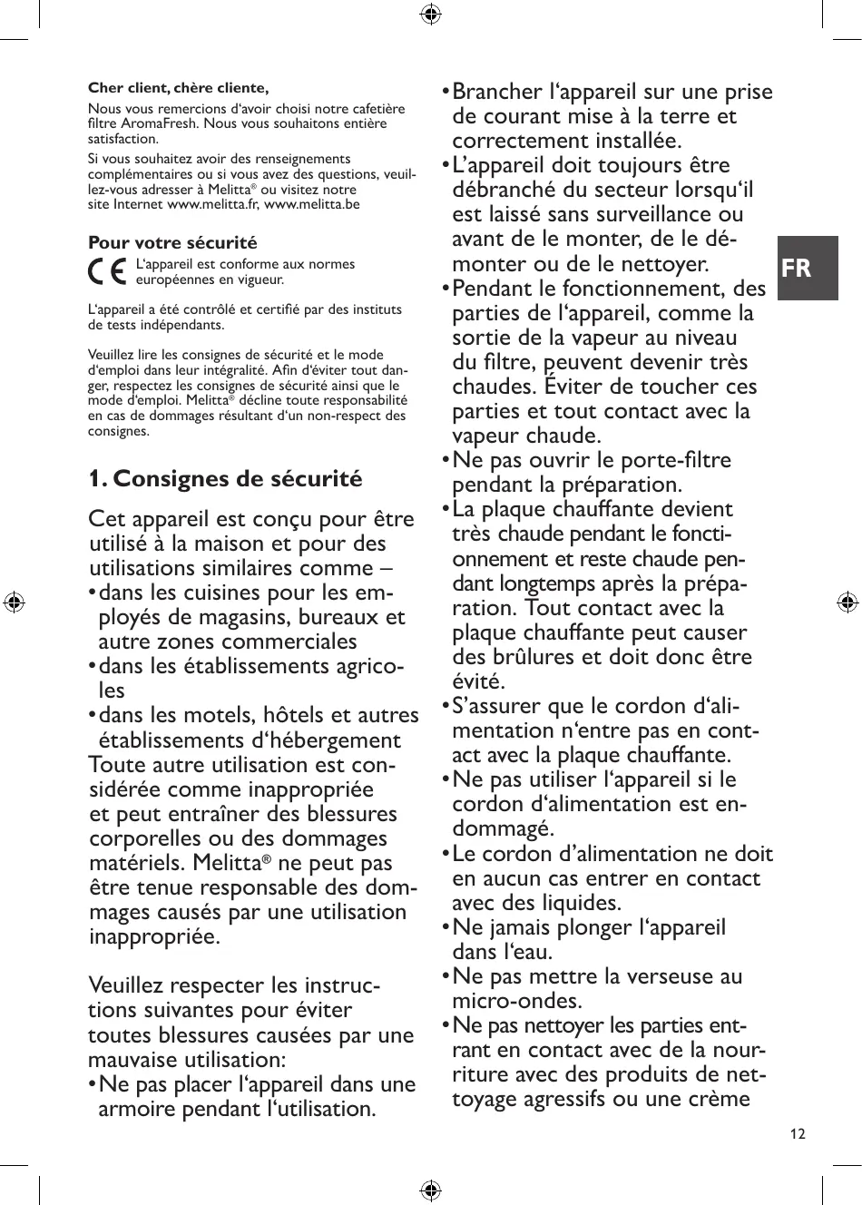 • Brancher l‘appareil sur une prise de courant mise à la terre et correctement installée. • L’appareil doit toujours être débranché du secteur lorsqu‘il est laissé sans surveillance ou avant de le monter, de le déPour votre sécurité L‘appareil est conforme aux normes monter ou de le nettoyer. FR européennes en vigueur. • Pendant le fonctionnement, des L‘appareil a été contrôlé et certifié par des instituts parties de l‘appareil, comme la de tests indépendants. sortie de la vapeur au niveau Veuillez lire les consignes de sécurité et le mode du filtre, peuvent devenir très d‘emploi dans leur intégralité. Afin d‘éviter tout danger, respectez les consignes de sécurité ainsi que le chaudes. Éviter de toucher ces mode d‘emploi. Melitta décline toute responsabilité parties et tout contact avec la en cas de dommages résultant d‘un non-respect des consignes. vapeur chaude. • Ne pas ouvrir le porte-filtre 1. Consignes de sécurité pendant la préparation. • La plaque chauffante devient Cet appareil est conçu pour être très chaude pendant le fonctiutilisé à la maison et pour des onnement et reste chaude penutilisations similaires comme – dant longtemps après la prépa• dans les cuisines pour les emration. Tout contact avec la ployés de magasins, bureaux et plaque chauffante peut causer autre zones commerciales des brûlures et doit donc être • dans les établissements agricoévité. les • • dans les motels, hôtels et autres S’assurer que le cordon d‘alimentation n‘entre pas en contétablissements d‘hébergement act avec la plaque chauffante. Toute autre utilisation est con• Ne pas utiliser l‘appareil si le sidérée comme inappropriée cordon d‘alimentation est enet peut entraîner des blessures dommagé. corporelles ou des dommages • Le cordon d’alimentation ne doit matériels. Melitta® ne peut pas être tenue responsable des dom- en aucun cas entrer en contact avec des liquides. mages causés par une utilisation • Ne jamais plonger l‘appareil inappropriée. dans l‘eau. • Ne pas mettre la verseuse au Veuillez respecter les instrucmicro-ondes. tions suivantes pour éviter • Ne pas nettoyer les parties enttoutes blessures causées par une rant en contact avec de la nourmauvaise utilisation: • Ne pas placer l‘appareil dans une riture avec des produits de nettoyage agressifs ou une crème armoire pendant l‘utilisation.