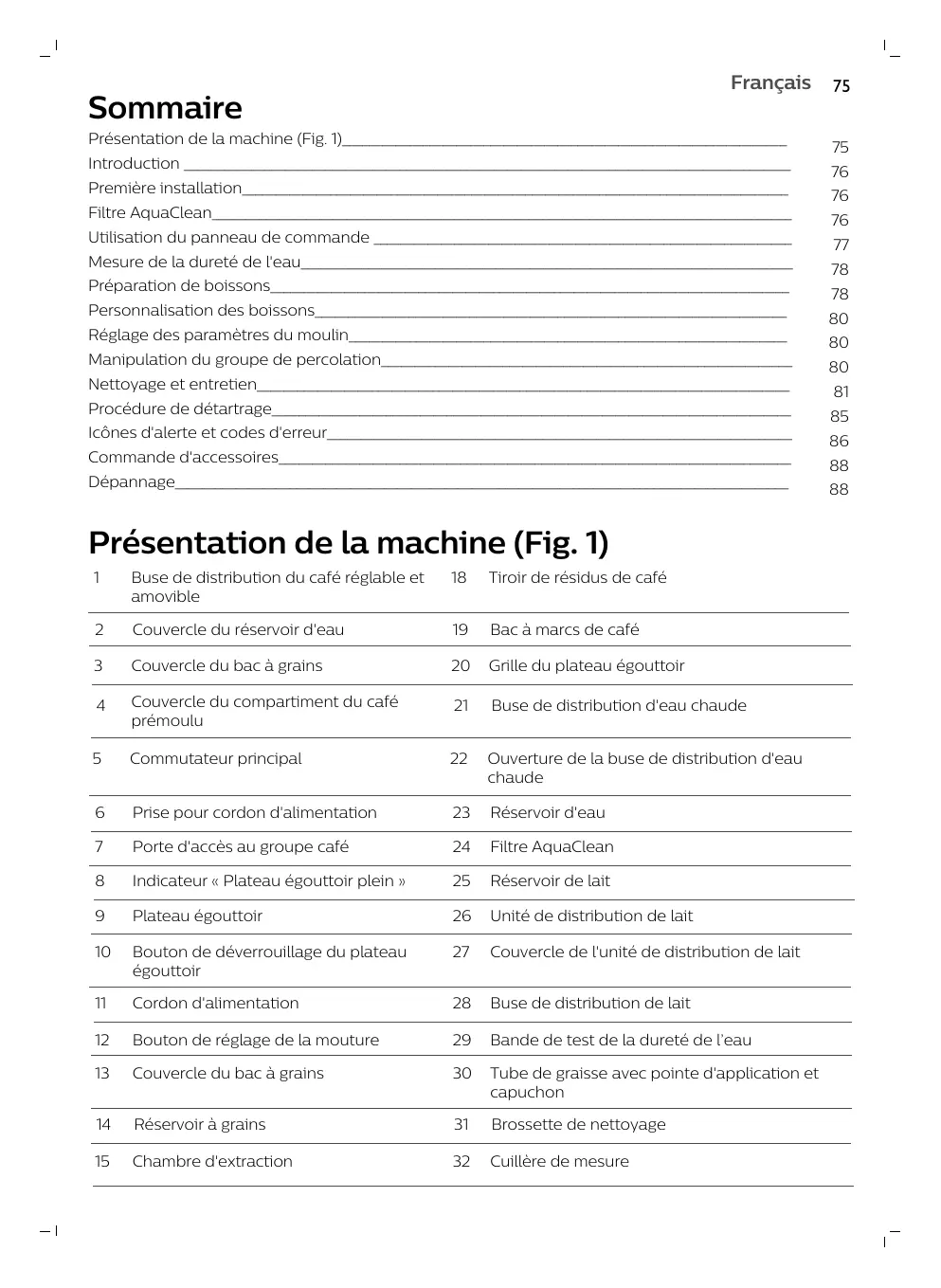 Conduit de sortie du café Introduction Félicitations pour votre achat d'une machine à café Saeco entièrement automatique ! Pour profiter pleinement de l’assistance Saeco, veuillez enregistrer votre produit à l’adresse www.saeco.com/care. Lisez attentivement le livret de sécurité distinct avant d’utiliser la machine pour la première fois, et conservez-le pour un usage ultérieur. Pour vous aider à utiliser votre machine de manière optimale, Saeco offre une assistance complète de 3 manières différentes : 1 Le guide de mise en route séparé pour la première installation et utilisation. 2 Ce mode d'emploi donnant des informations détaillées 3 Assistance et vidéos en ligne : scannez le code QR sur la première page ou consultez le site www.saeco.com/care Remarque : Cette machine a été testée avec du café. Bien qu'elle ait été soigneusement nettoyée, il se peut que quelques résidus de café subsistent. Nous garantissons néanmoins que la machine est entièrement neuve. Première installation Avant la première utilisation de votre machine à café, vous devez effectuer quelques étapes simples, comme remplir le circuit d'eau et activer le filtre AquaClean. Ces procédures sont expliquées dans le guide distinct de mise en route. Pour un excellent café, vous devez commencer par préparer 5 cafés afin de permettre l'auto-réglage de l'appareil. L'appareil a été configuré de manière à extraire une saveur optimale de vos grains de café. Nous vous conseillons donc de ne pas modifier les réglages du moulin avant d'avoir préparé 100 à 150 tasses (environ 1 mois d'utilisation). Filtre AquaClean Le filtre AquaClean est conçu pour réduire les dépôts de calcaire dans votre machine à café et fournir une eau filtrée pour préserver l’arôme et le goût de chaque tasse de café. Si vous utilisez une série de huit filtres AquaClean tel qu’indiqué par la machine et dans le présent mode d'emploi, il ne sera pas nécessaire de détartrer votre machine avant d’avoir servi 5 000 tasses. Chaque filtre permet de servir jusqu'à 625 tasses, en fonction des variétés de café sélectionnées et de la fréquence de rinçage et de nettoyage. Préparation du filtre AquaClean avant son activation Avant de placer le filtre AquaClean dans le réservoir d’eau, vous devez le préparer à l’utilisation : 1 Secouez la cartouche pendant environ 5 secondes (Fig. 2). 2 Plongez le filtre à l’envers dans un pichet d’eau froide et attendez jusqu’à ce que plus aucune bulle d’air ne sorte (Fig. 3). 3 Poussez le filtre dans le raccordement du filtre au niveau le plus bas possible. Français