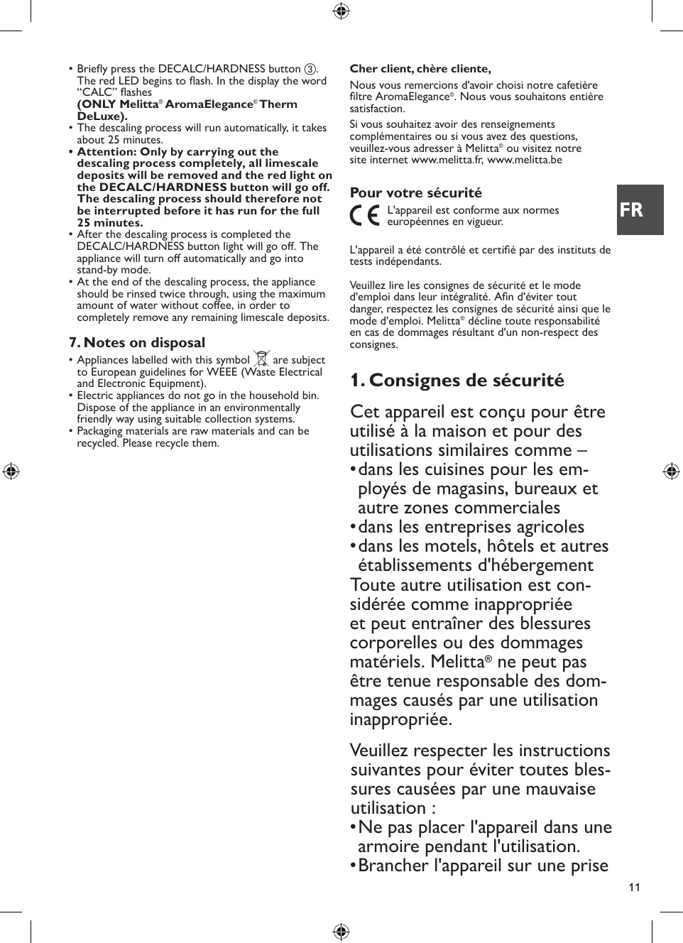 Cher client, chère cliente, Nous vous remercions d'avoir choisi notre cafetière filtre AromaElegance®. Nous vous souhaitons entière satisfaction. Si vous souhaitez avoir des renseignements complémentaires ou si vous avez des questions, veuillez-vous adresser à Melitta® ou visitez notre site internet www.melitta.fr, www.melitta.be