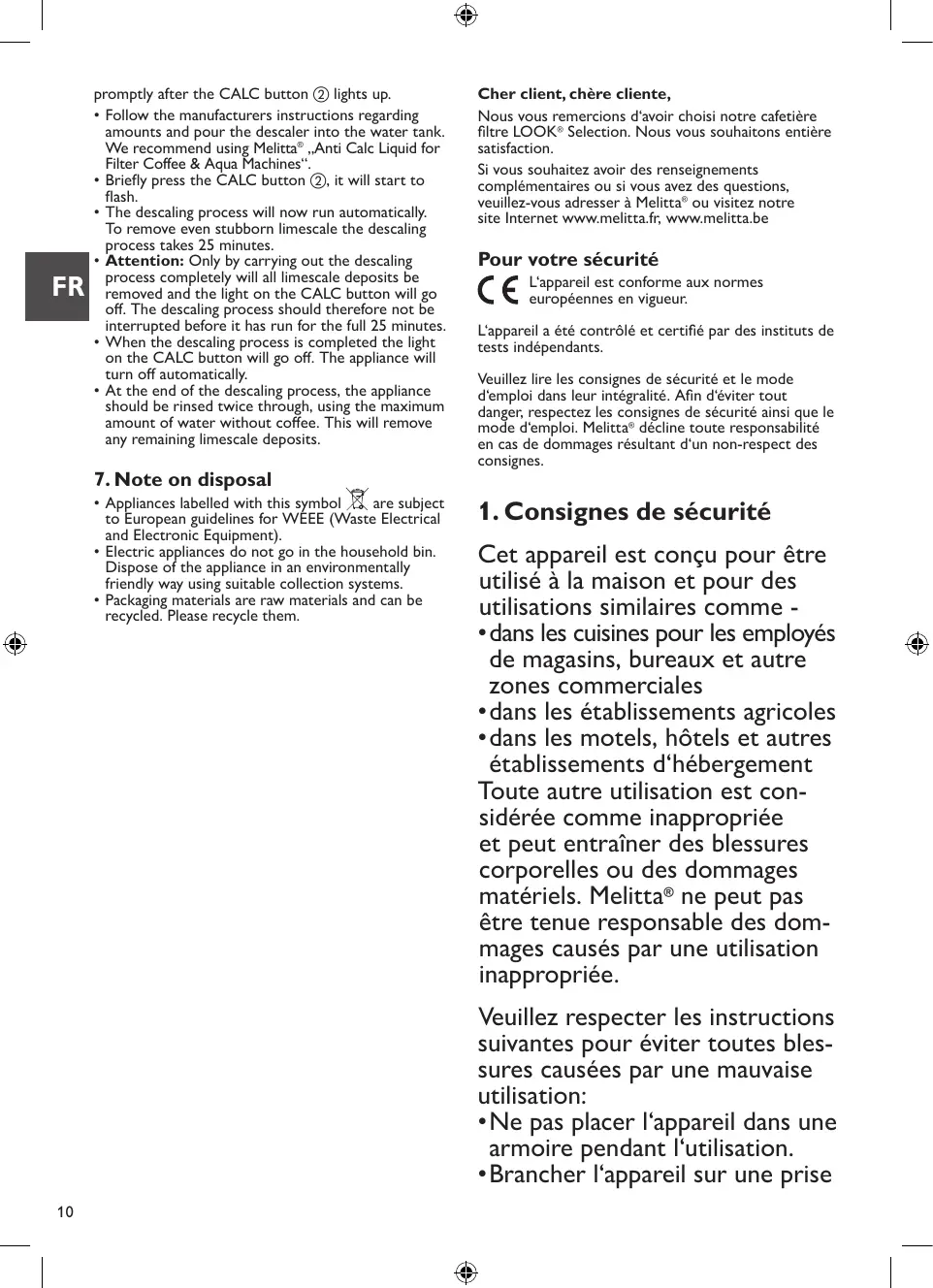 L‘appareil est conforme aux normes européennes en vigueur. L‘appareil a été contrôlé et certifié par des instituts de tests indépendants. Veuillez lire les consignes de sécurité et le mode d‘emploi dans leur intégralité. Afin d‘éviter tout danger, respectez les consignes de sécurité ainsi que le mode d‘emploi. Melitta® décline toute responsabilité en cas de dommages résultant d‘un non-respect des consignes.
