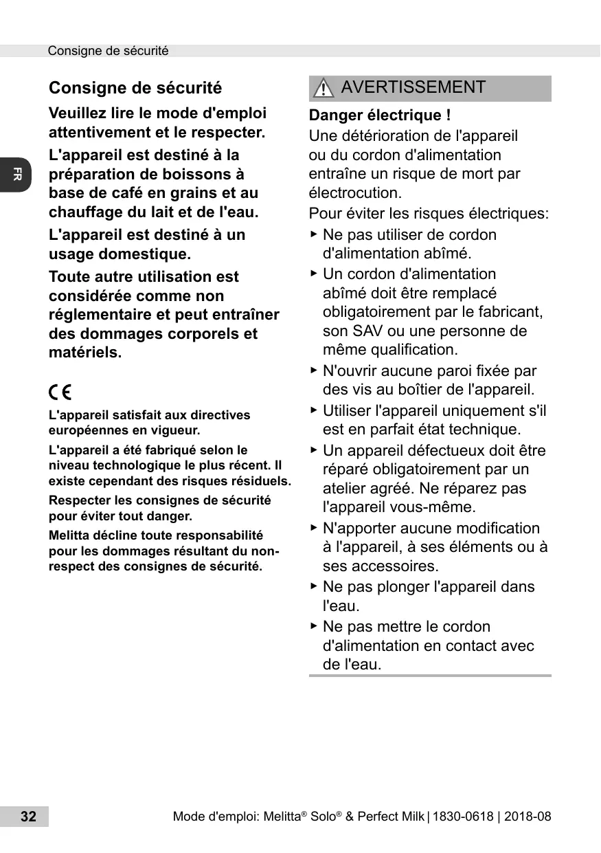 L'appareil a été fabriqué selon le niveau technologique le plus récent. Il existe cependant des risques résiduels. Respecter les consignes de sécurité pour éviter tout danger. Melitta décline toute responsabilité pour les dommages résultant du nonrespect des consignes de sécurité.