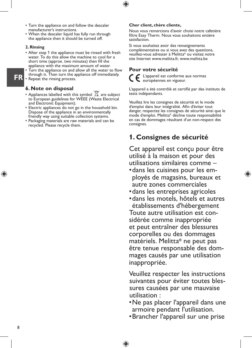 L‘appareil est conforme aux normes européennes en vigueur. L‘appareil a été contrôlé et certifié par des instituts de tests indépendants. Veuillez lire les consignes de sécurité et le mode d‘emploi dans leur intégralité. Afin d‘éviter tout danger, respectez les consignes de sécurité ainsi que le mode d‘emploi. Melitta® décline toute responsabilité en cas de dommages résultant d‘un non-respect des consignes.