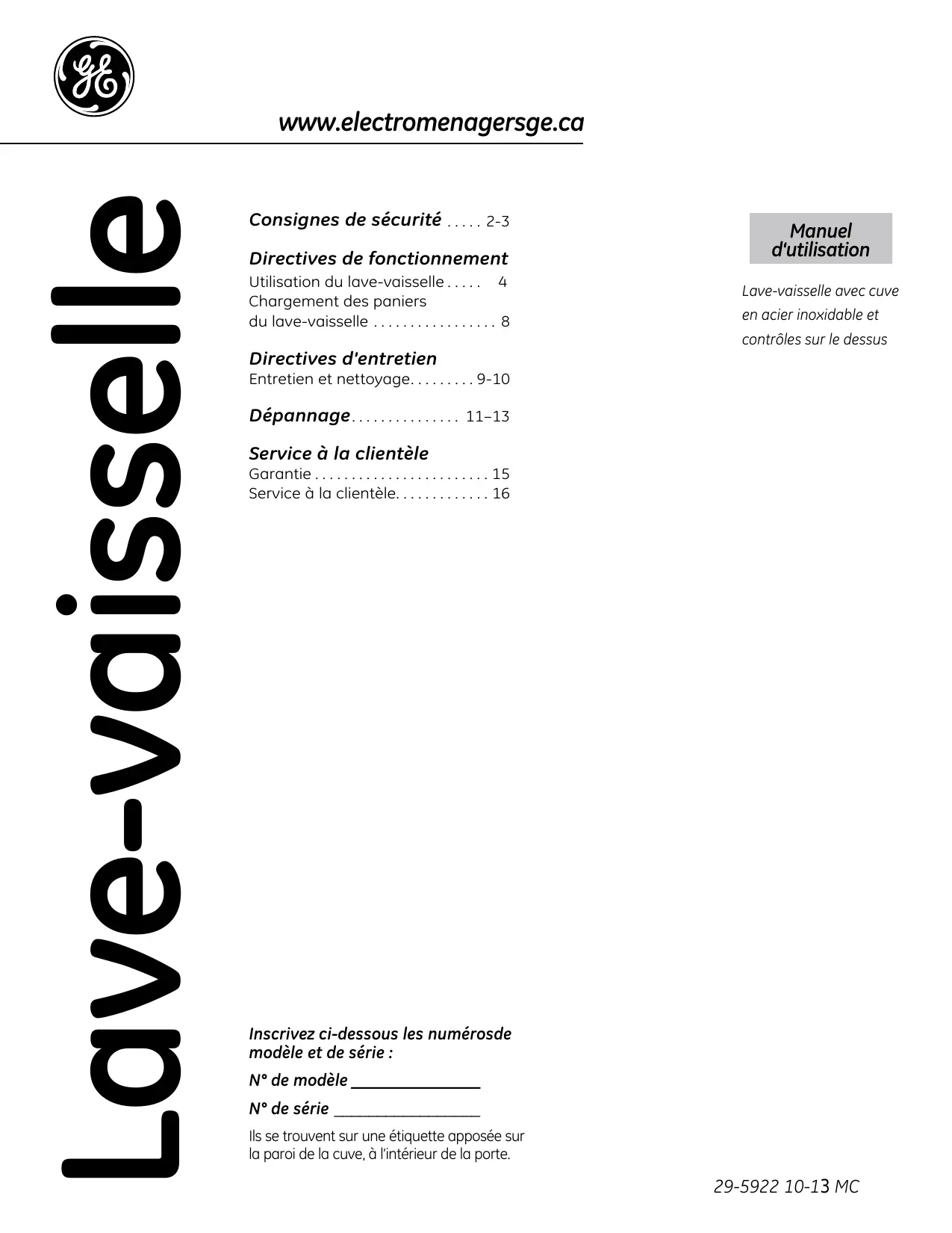 Consignes de sécurité . . . . . 2-3 Directives de fonctionnement Utilisation du lave-vaisselle. . . . . . 4 Chargement des paniers du lave-vaisselle . . . . . . . . . . . . . . . . . . 8
