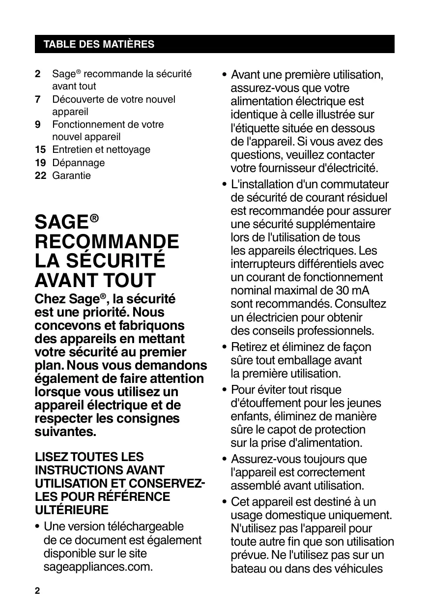 Sage® recommande la sécurité avant tout 7 Découverte de votre nouvel appareil 9 Fonctionnement de votre nouvel appareil 15 Entretien et nettoyage 19 Dépannage 22 Garantie