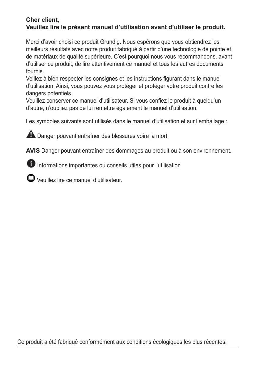 Cher client, Veuillez lire le présent manuel d’utilisation avant d’utiliser le produit. Merci d’avoir choisi ce produit Grundig. Nous espérons que vous obtiendrez les meilleurs résultats avec notre produit fabriqué à partir d’une technologie de pointe et de matériaux de qualité supérieure. C’est pourquoi nous vous recommandons, avant d’utiliser ce produit, de lire attentivement ce manuel et tous les autres documents fournis. Veillez à bien respecter les consignes et les instructions figurant dans le manuel d’utilisation. Ainsi, vous pouvez vous protéger et protéger votre produit contre les dangers potentiels. Veuillez conserver ce manuel d’utilisateur. Si vous confiez le produit à quelqu’un d’autre, n’oubliez pas de lui remettre également le manuel d’utilisation. Les symboles suivants sont utilisés dans le manuel d’utilisation et sur l’emballage : Danger pouvant entraîner des blessures voire la mort. AVIS Danger pouvant entraîner des dommages au produit ou à son environnement. Informations importantes ou conseils utiles pour l’utilisation Veuillez lire ce manuel d’utilisateur. Ce produit a été fabriqué conformément aux conditions écologiques les plus récentes.