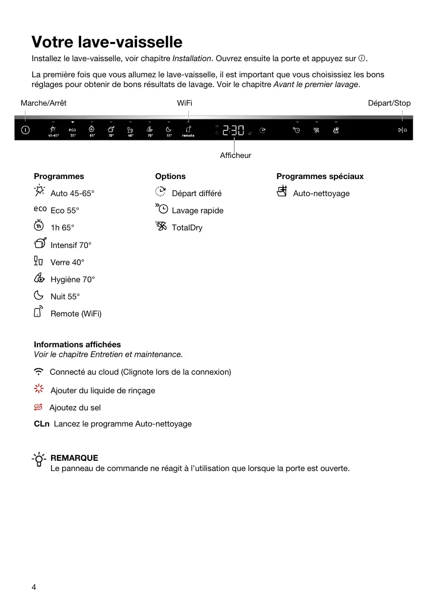 REMARQUE Le panneau de commande ne réagit à l’utilisation que lorsque la porte est ouverte.