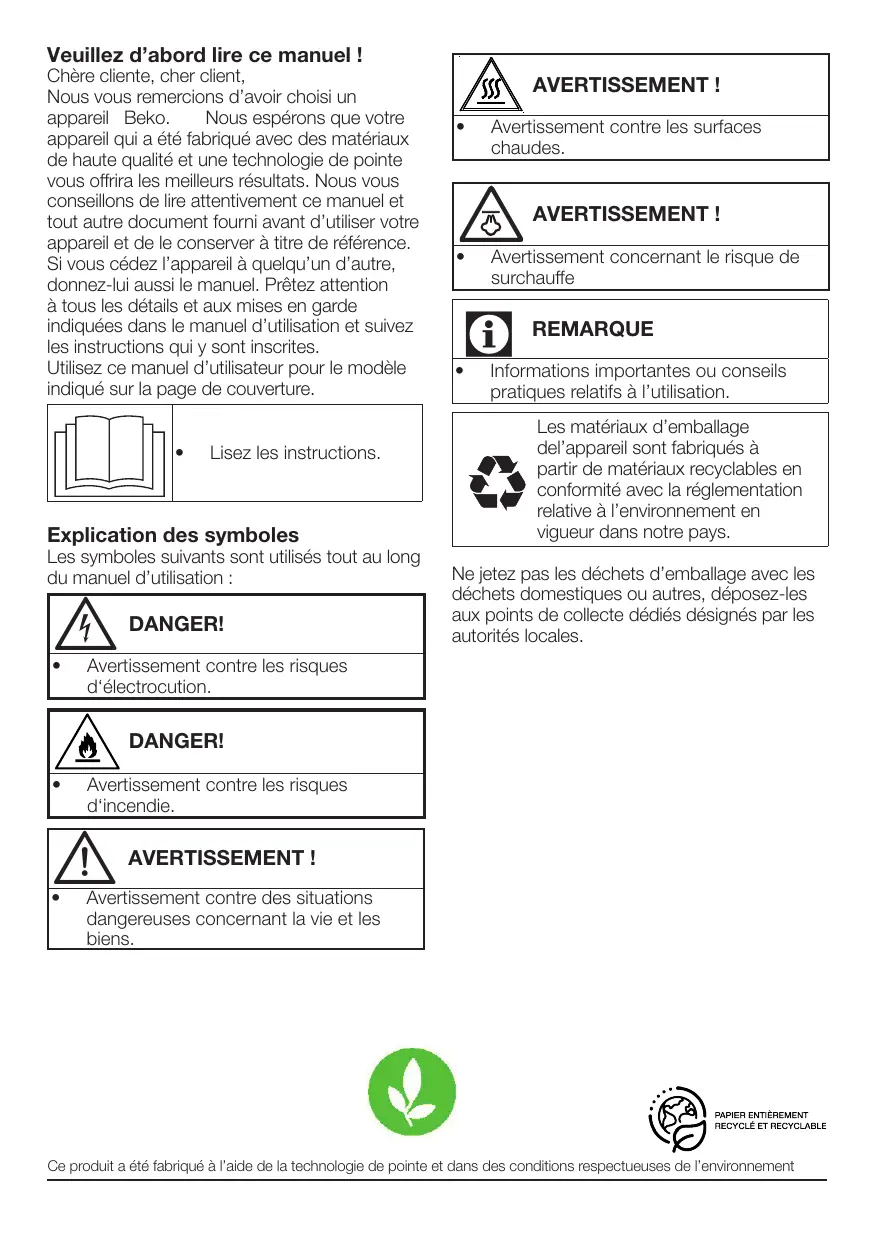 REMARQUE Informations importantes ou conseils pratiques relatifs à l’utilisation. Les matériaux d’emballage del’appareil sont fabriqués à partir de matériaux recyclables en conformité avec la réglementation relative à l’environnement en vigueur dans notre pays. Ne jetez pas les déchets d’emballage avec les déchets domestiques ou autres, déposez-les aux points de collecte dédiés désignés par les autorités locales. Avertissement contre les risques d‘électrocution. DANGER!
