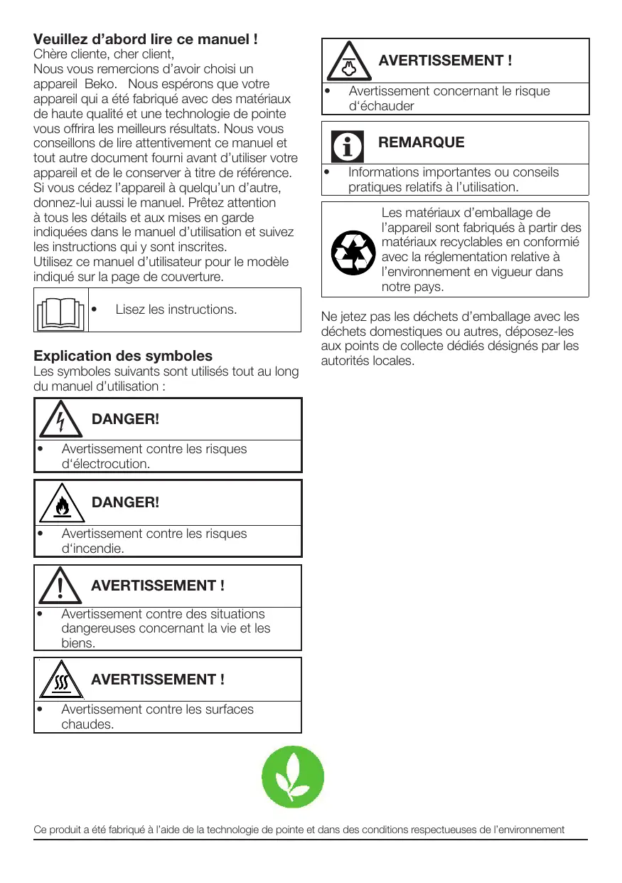 Avertissement contre les surfaces chaudes. Ce produit a été fabriqué à l’aide de la technologie de pointe et dans des conditions respectueuses de l’environnement Sèche-linge / Manuel de l’utilisateur