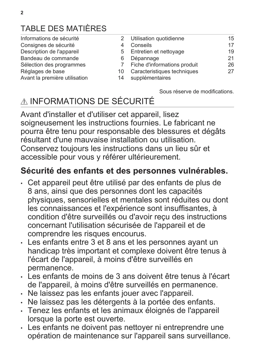 TABLE DES MATIÈRES Informations de sécurité Consignes de sécurité Description de l'appareil Bandeau de commande Sélection des programmes Réglages de base Avant la première utilisation