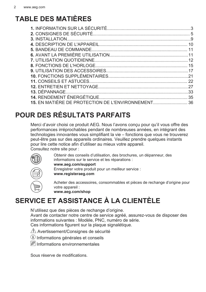 Merci d’avoir choisi ce produit AEG. Nous l’avons conçu pour qu’il vous offre des performances irréprochables pendant de nombreuses années, en intégrant des technologies innovantes vous simplifiant la vie – fonctions que vous ne trouverez peut-être pas sur des appareils ordinaires. Veuillez prendre quelques instants pour lire cette notice afin d’utiliser au mieux votre appareil. Consultez notre site pour : Obtenir des conseils d’utilisation, des brochures, un dépanneur, des informations sur le service et les réparations : www.aeg.com/support Enregistrer votre produit pour un meilleur service : www.registeraeg.com Acheter des accessoires, consommables et pièces de rechange d’origine pour votre appareil : www.aeg.com/shop