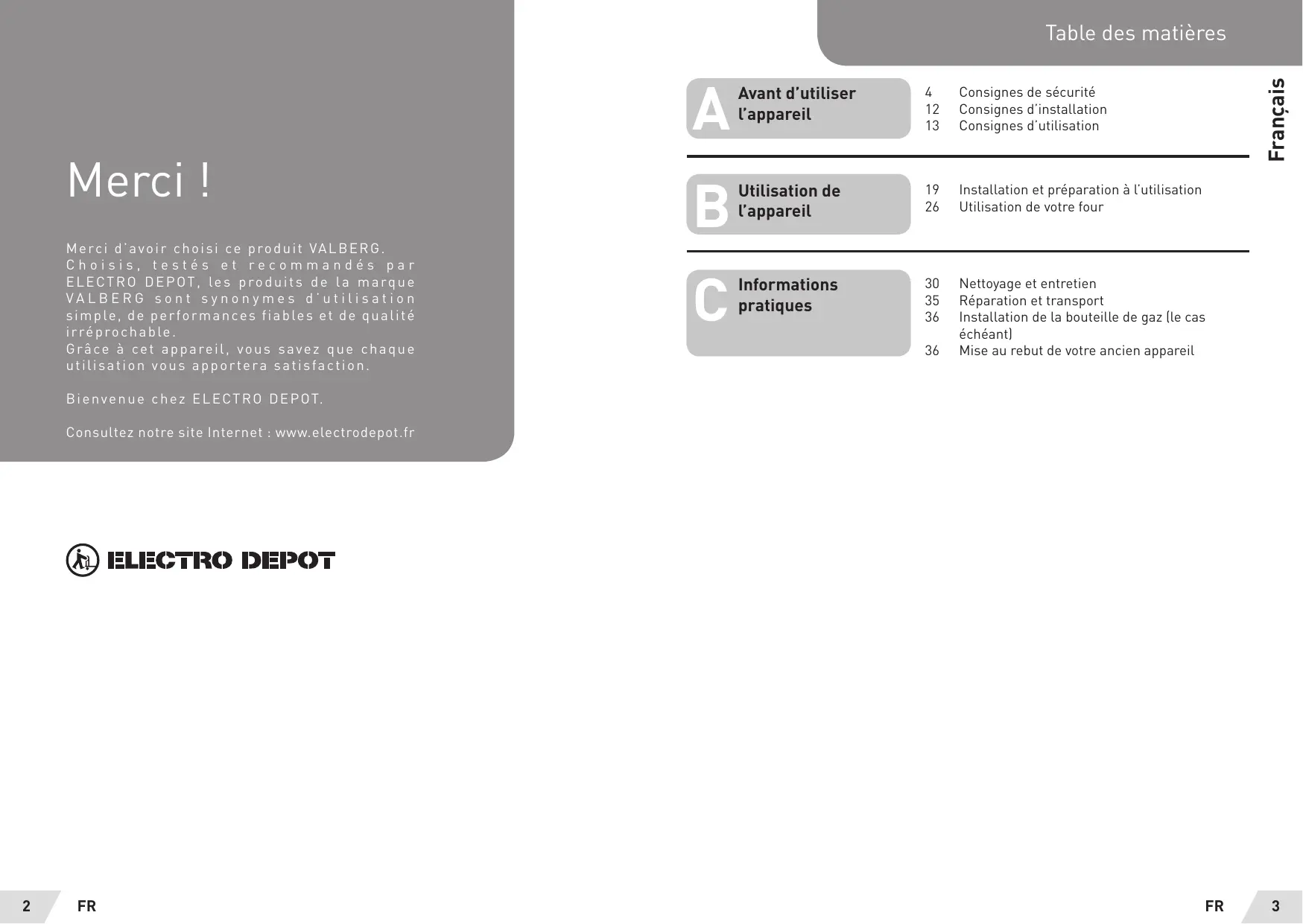 Choisis, testés et recommandés par E L E C T R O D E P O T , l e s p ro d u i t s d e l a m a rq u e VALBERG sont synonymes d’utilisation s i m p le , d e p e r f o r m a n c e s f i a b le s e t d e q u a l i t é i r ré p ro c h a b le . G r â c e à c e t a p p a re i l , v o u s s a v e z q u e c h a q u e utilisation vous apportera satisfaction.