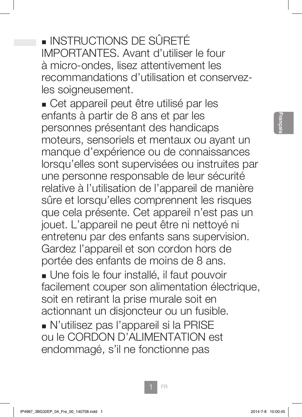 IMPORTANTES. Avant d’utiliser le four à micro-ondes, lisez attentivement les recommandations d’utilisation et conservezles soigneusement. Cet appareil peut être utilisé par les enfants à partir de 8 ans et par les personnes présentant des handicaps moteurs, sensoriels et mentaux ou ayant un manque d’expérience ou de connaissances lorsqu’elles sont supervisées ou instruites par une personne responsable de leur sécurité relative à l’utilisation de l’appareil de manière sûre et lorsqu’elles comprennent les risques que cela présente. Cet appareil n’est pas un jouet. L’appareil ne peut être ni nettoyé ni entretenu par des enfants sans supervision. Gardez l’appareil et son cordon hors de portée des enfants de moins de 8 ans. Une fois le four installé, il faut pouvoir facilement couper son alimentation électrique, soit en retirant la prise murale soit en actionnant un disjoncteur ou un fusible. N’utilisez pas l’appareil si la PRISE ou le CORDON D’ALIMENTATION est endommagé, s’il ne fonctionne pas