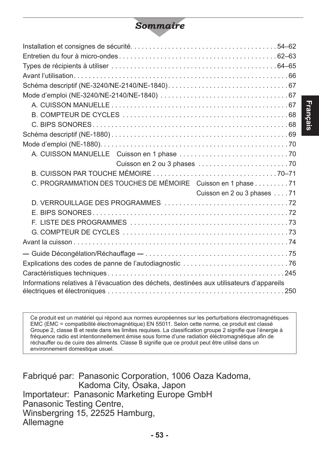 Entretien du four à micro-ondes . . . . . . . . . . . . . . . . . . . . . . . . . . . . . . . . . . . . . . . . . 62–63 Types de récipients à utiliser . . . . . . . . . . . . . . . . . . . . . . . . . . . . . . . . . . . . . . . . . . . . 64–65 Avant l’utilisation . . . . . . . . . . . . . . . . . . . . . . . . . . . . . . . . . . . . . . . . . . . . . . . . . . . . . . . . 66 Schéma descriptif (NE-3240/NE-2140/NE-1840) . . . . . . . . . . . . . . . . . . . . . . . . . . . . . . . 67 Mode d’emploi (NE-3240/NE-2140/NE-1840) . . . . . . . . . . . . . . . . . . . . . . . . . . . . . . . . . . 67 A. CUISSON MANUELLE . . . . . . . . . . . . . . . . . . . . . . . . . . . . . . . . . . . . . . . . . . . . . . 67 B. COMPTEUR DE CYCLES . . . . . . . . . . . . . . . . . . . . . . . . . . . . . . . . . . . . . . . . . . . . 68 C. BIPS SONORES . . . . . . . . . . . . . . . . . . . . . . . . . . . . . . . . . . . . . . . . . . . . . . . . . . . 68 Schéma descriptif (NE-1880) . . . . . . . . . . . . . . . . . . . . . . . . . . . . . . . . . . . . . . . . . . . . . . 69 Mode d’emploi (NE-1880) . . . . . . . . . . . . . . . . . . . . . . . . . . . . . . . . . . . . . . . . . . . . . . . . . 70 A. CUISSON MANUELLE Cuisson en 1 phase . . . . . . . . . . . . . . . . . . . . . . . . . . . . . 70 Cuisson en 2 ou 3 phases . . . . . . . . . . . . . . . . . . . . . . . . 70 B. CUISSON PAR TOUCHE MÉMOIRE . . . . . . . . . . . . . . . . . . . . . . . . . . . . . . . . 70–71 C. PROGRAMMATION DES TOUCHES DE MÉMOIRE Cuisson en 1 phase . . . . . . . . 71 Cuisson en 2 ou 3 phases . . . . 71 D. VERROUILLAGE DES PROGRAMMES . . . . . . . . . . . . . . . . . . . . . . . . . . . . . . . . . 72 E. BIPS SONORES . . . . . . . . . . . . . . . . . . . . . . . . . . . . . . . . . . . . . . . . . . . . . . . . . . . 72 F. LISTE DES PROGRAMMES . . . . . . . . . . . . . . . . . . . . . . . . . . . . . . . . . . . . . . . . . . 73 G. COMPTEUR DE CYCLES . . . . . . . . . . . . . . . . . . . . . . . . . . . . . . . . . . . . . . . . . . . . 73 Avant la cuisson . . . . . . . . . . . . . . . . . . . . . . . . . . . . . . . . . . . . . . . . . . . . . . . . . . . . . . . . 74