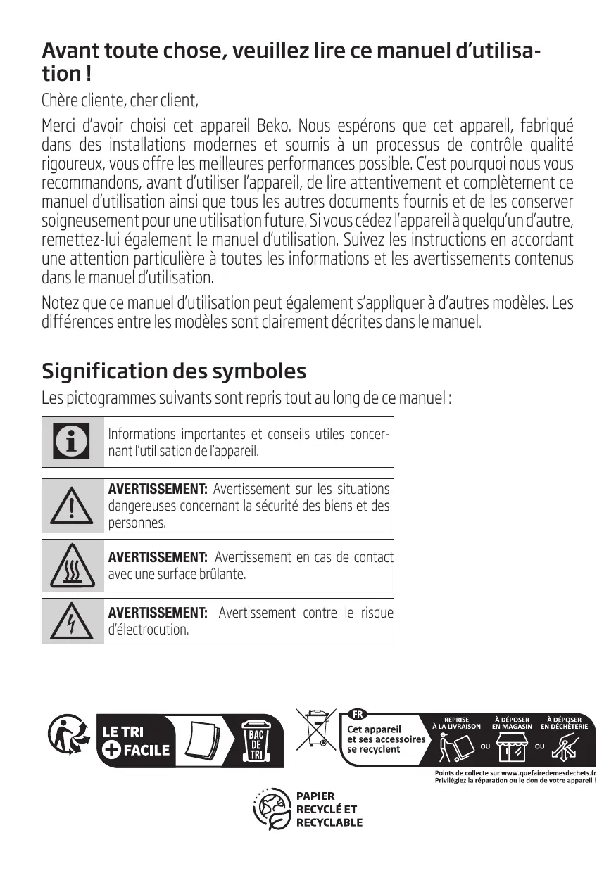 It takes longer than before for the The selected microwave power Select a higher power level. food to heat up in the microwave level is too low. A larger amount than usual has Double the amount = almost double the been placed in the appliance. cooking time. The food was colder than usual. Stir or turn the food during cooking. Turntable grates or grinds. Dirt or debris in the area around the Clean the rollers under the turntable and the turntable drive. recess in the oven floor thoroughly. A particular operating mode or power level cannot be set. The temperature, power level or Choose permitted settings. combined setting is not possible for this operating mode. “‚ appears in the display panel. The thermal safety switch-off Call the after-sales service. function has been activated. “… appears in the display panel. The thermal safety switch-off Call the after-sales service. function has been activated. “‚‚ appears in the display panel. Moisture in the control panel. Allow the control panel to dry. “‚ˆ appears in the display panel. Rapid heating has failed. Call the after-sales service. Microwave Oven / User Manual 41 / EN Avant toute chose, veuillez lire ce manuel d’utilisation ! Chère cliente, cher client, Merci d’avoir choisi cet appareil Beko. Nous espérons que cet appareil, fabriqué dans des installations modernes et soumis à un processus de contrôle qualité rigoureux, vous offre les meilleures performances possible. C’est pourquoi nous vous recommandons, avant d’utiliser l’appareil, de lire attentivement et complètement ce manuel d’utilisation ainsi que tous les autres documents fournis et de les conserver soigneusement pour une utilisation future. Si vous cédez l’appareil à quelqu’un d’autre, remettez-lui également le manuel d’utilisation. Suivez les instructions en accordant une attention particulière à toutes les informations et les avertissements contenus dans le manuel d’utilisation. Notez que ce manuel d’utilisation peut également s’appliquer à d’autres modèles. Les différences entre les modèles sont clairement décrites dans le manuel. Signification des symboles Les pictogrammes suivants sont repris tout au long de ce manuel :