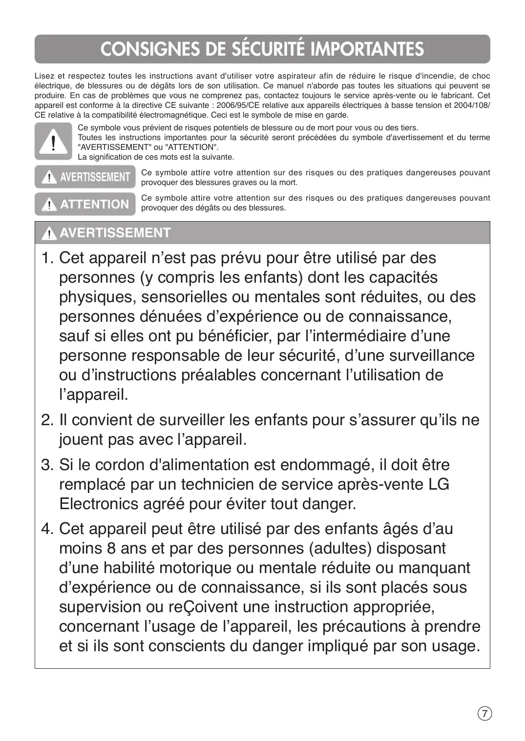 • Cet aspirateur n'est pas destiné à être utilisé par de jeunes enfants ou des personnes invalides sans surveillance. Vous risquez sinon de vous blesser ou d'endommager l'appareil. • Utilisez uniquement des pièces produites ou recommandées par le service après-vente de LG Electronics. Vous risquez sinon d'endommager l'appareil.