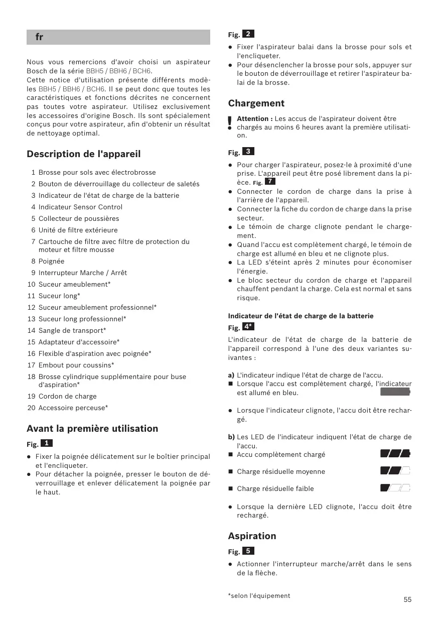Congratulations on your purchase of the Bosch BBH5 / BBH6 / BCH6 vacuum cleaner. This instruction manual describes various BBH5 / BBH6 / BCH6 models, which means that some of the equipment features and functions described may not apply to your model. You should only use original Bosch accessories, which have been specially developed for your vacuum cleaner, in order to achieve the best possible vacuuming results. Description de l'appareil 1 Brosse pour sols avec électrobrosse 2 Bouton de déverrouillage du collecteur de saletés 3 Indicateur de l'état de charge de la batterie 4 Indicateur Sensor Control 5 Collecteur de poussières