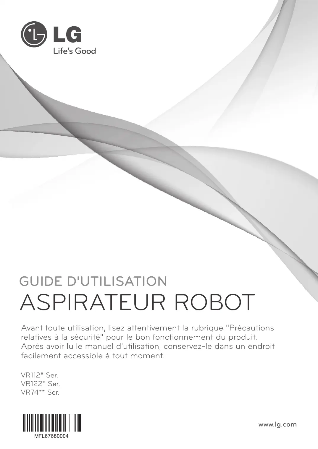 GUIDE D'UTILISATION ASPIRATEUR ROBOT Avant toute utilisation, lisez attentivement la rubrique "Précautions relatives à la sécurité" pour le bon fonctionnement du produit. Après avoir lu le manuel d'utilisation, conservez-le dans un endroit facilement accessible à tout moment. VR112* Ser. VR122* Ser. VR74** Ser. www.lg.com