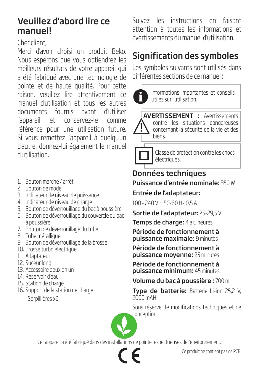 | Compatibilités | Accessoires compatibles avec les aspirateurs BEKO |