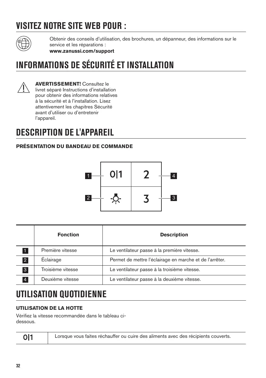 UTILISATION QUOTIDIENNE UTILISATION DE LA HOTTE Vérifiez la vitesse recommandée dans le tableau cidessous.