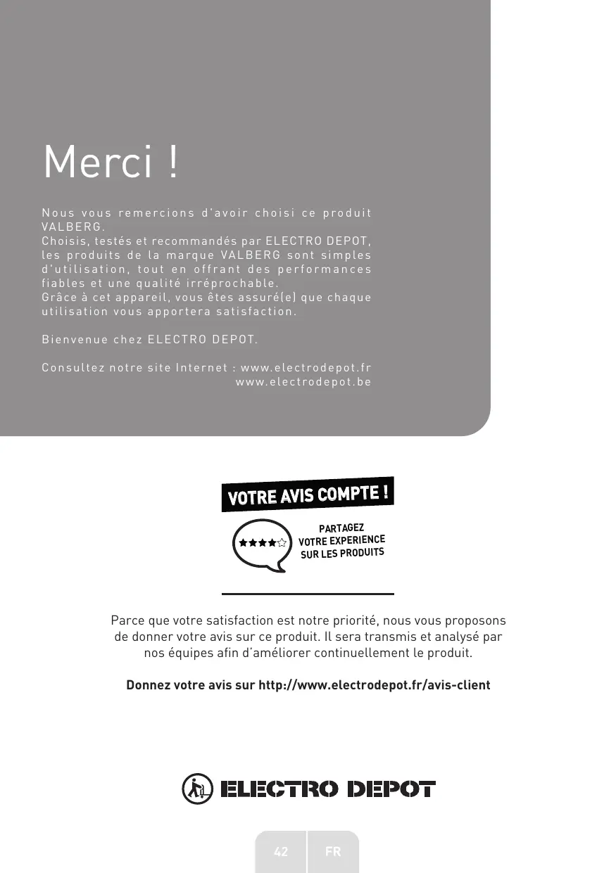 Nous vous remercions d'avoir choisi ce produit VA L B E R G . Choisis, testés et recommandés par ELECTRO DEPOT, l e s p ro d u i t s d e l a m a rq u e VA L B E R G s o n t s i m p l e s d'utilisation, tout en offrant des performances f i a b le s e t u n e q u a l i t é i r ré p ro c h a b le . G râ ce à ce t a p p a re i l , vo u s ê te s a ss u ré ( e ) q u e c h a q u e utilisation vous apportera satisfaction. B i e n v e n u e c h e z E L E C T R O D E P O T. C o n s u l t e z n o t re s i t e I n t e r n e t : w w w. e le c t ro d e p o t . f r