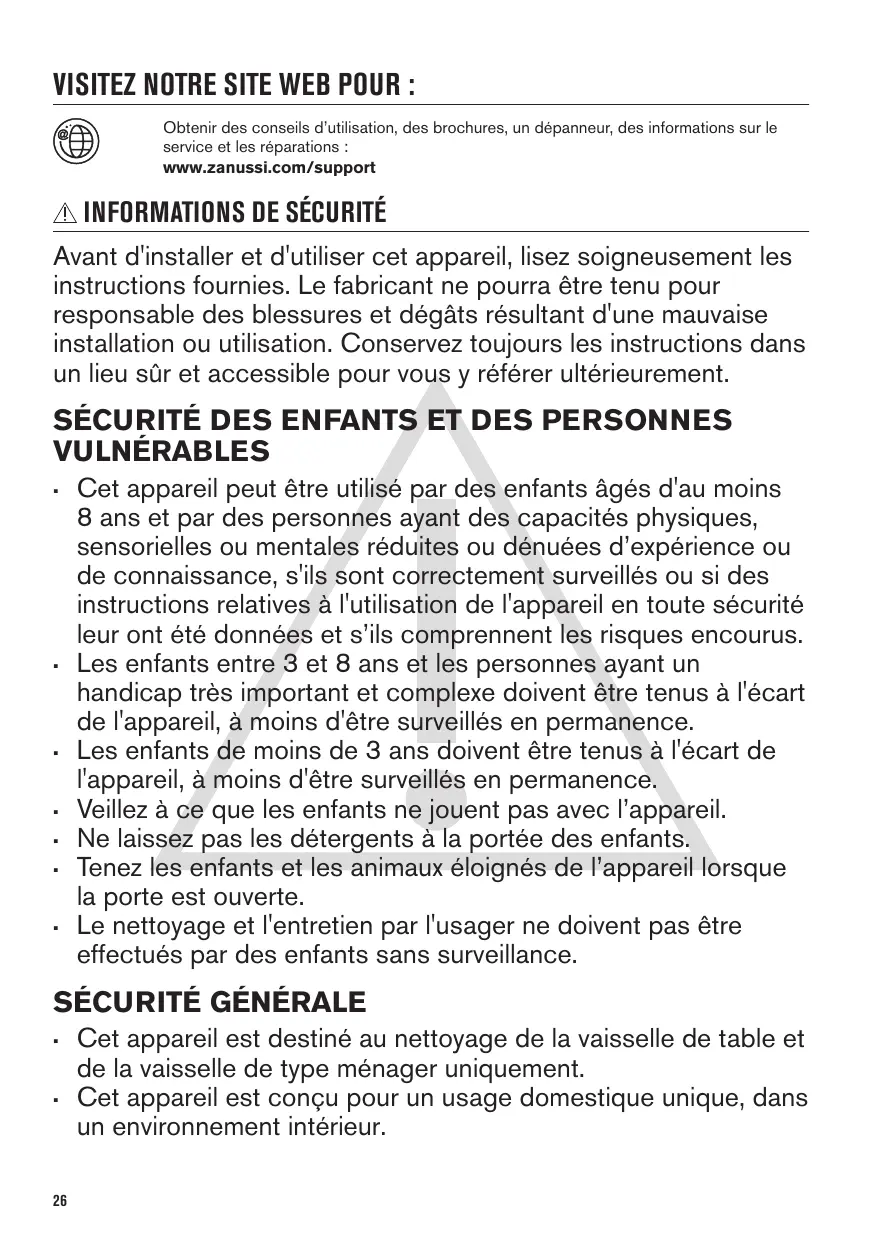 VISITEZ NOTRE SITE WEB POUR : Obtenir des conseils d’utilisation, des brochures, un dépanneur, des informations sur le service et les réparations : www.zanussi.com/support