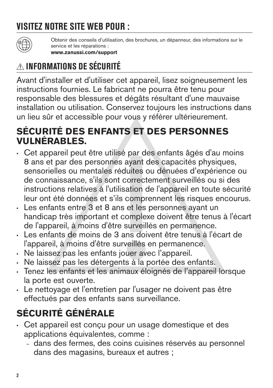 VISITEZ NOTRE SITE WEB POUR : Obtenir des conseils d’utilisation, des brochures, un dépanneur, des informations sur le service et les réparations : www.zanussi.com/support
