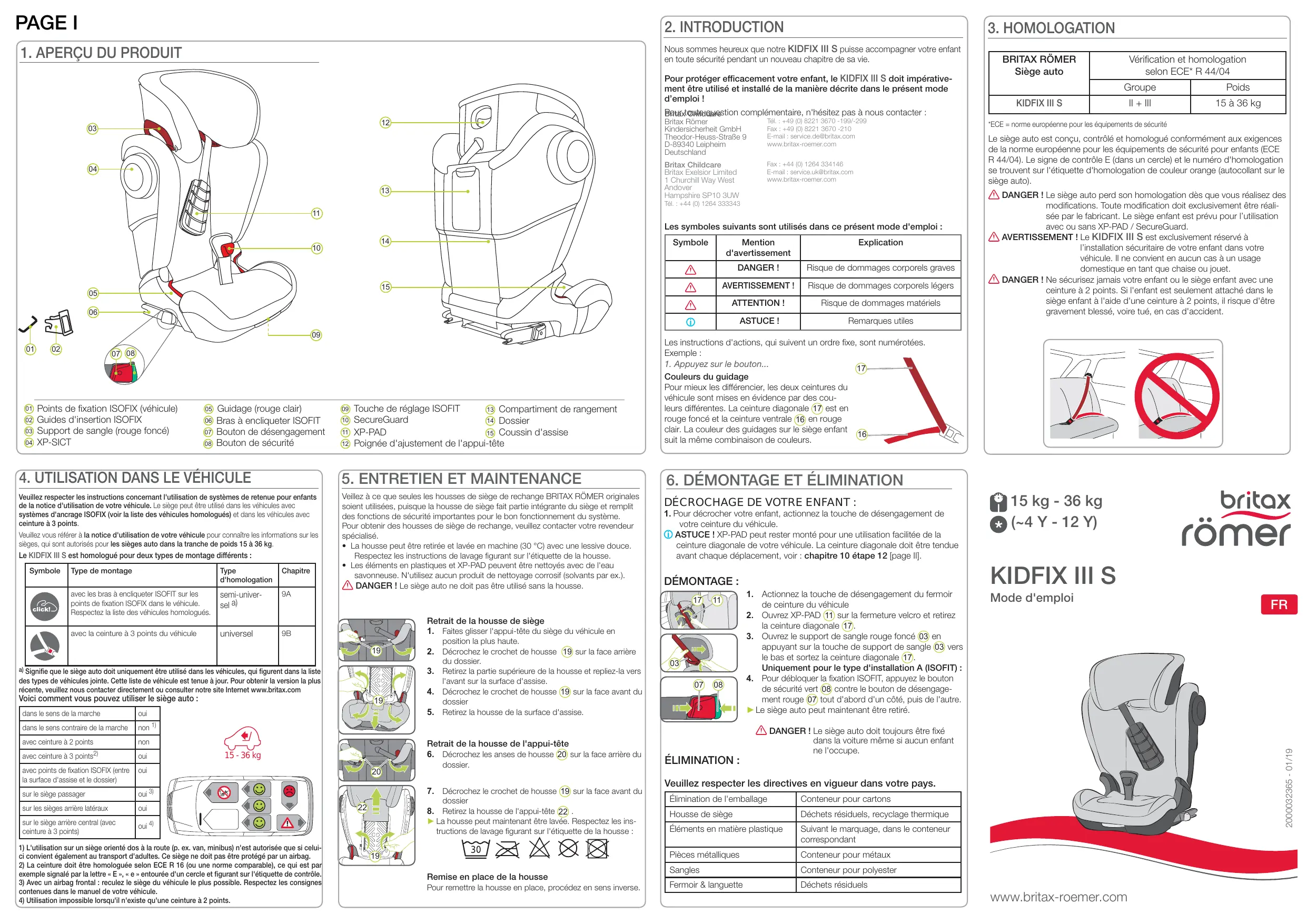 PAGE II 7. CONSIGNES DE SÉCURITÉ Prenez le temps de lire attentivement ces instructions et conservez les toujours à portée de main dans le compartiment de rangement prévu à cet effet 13 dans le siège enfant pour une consultation ultérieure ! Ce mode d'emploi doit être joint au siège enfant, lorsque celui-ci est transmis à un tiers ! DANGER ! Pour la protection de votre enfant : • En cas de collision à une vitesse supérieure à 10 km/h, le siège enfant peut être endommagé dans certaines conditions sans que le dommage ne soit directement visible. Dans ce cas, le siège auto doit être remplacé. Veuillez éliminer l'ancien siège auto selon la réglementation. • Faites toujours vérifier le siège auto en cas d'endommagement (par ex. lorsqu'il est tombé au sol). • Contrôlez régulièrement l'état de toutes les pièces importantes. Assurez-vous qu'en particulier toutes les pièces mécaniques fonctionnement parfaitement. • Veuillez ne pas graisser, ni huiler les pièces du siège auto. • Ne laissez jamais votre enfant dans le siège dans le véhicule sans surveillance. • Laissez exclusivement votre enfant monter dans le véhicule ou descendre du côté du trottoir. • Protégez le siège enfant du rayonnement solaire intensif direct tant qu'il n'est pas utilisé. Le siège enfant peut devenir très chaud lorsqu'il est directement exposé aux rayons du soleil. La peau des enfants est fragile et risque d'être lésée. • Plus la ceinture est proche du corps de votre enfant, plus celui-ci est protégé. Évitez pour cela d'enfiler des vêtements épais à votre enfant en-dessous de la ceinture. • Pendant les longs trajets, faites des pauses régulières pour permettre à votre enfant de se dépenser et de jouer. • Utilisation sur le siège arrière : faites glisser le siège avant de manière à ce que les pieds de votre enfant ne puissent pas toucher le dossier de celui-ci (pour éviter tout risque de blessures). DANGER ! Pour la protection de tous les passagers : En cas de freinage d'urgence ou d'accident, les objets et personnes non attachés risquent de blesser d'autres passagers. Veuillez donc toujours veiller à ce que… • les dossiers des sièges du véhicule soient verrouillés (enclenchez par ex. la banquette arrière rabattable), • tous les objets lourds ou à bords tranchants (par ex. sur la lunette arrière) soient bien fixés, • toutes les personnes aient mis leur ceinture, • le siège auto soit toujours fixé dans la voiture même si aucun enfant ne l'occupe. AVERTISSEMENT ! Pour la protection lors de la manipulation d'un siège enfant : • n'utilisez jamais le siège enfant de manière non installée, même pour l'essayer, • Le dossier 14 risque de basculer vers l'arrière. Placer toujours le siège enfant sur le siège du véhicule avant d’y installer votre enfant. • lors du redressement du dossier 14 , aucun objet ne doit se trouver dans la zone de l’axe d'articulation entre le dossier 14 et le coussin d’assise 15 . Vous ou votre enfant risquez par ex. de vous coincer les doigts ou de vous blesser. • Pour éviter toute détérioration, veillez à ce que le siège auto ne soit pas coincé entre des objets durs (porte du véhicule, glissière du siège, etc.). • Conservez le siège enfant dans un lieu sécurisé lorsque vous ne l'utilisez pas. Ne déposez aucun objet sur le siège et ne l'entreposez pas directement à proximité d'une source de chaleur ou exposé à la lumière directe du soleil. ATTENTION ! Pour la protection de votre véhicule : • Les housses de véhicule spécifiques, fabriquées à partir de matières délicates (par ex. velours, cuir, etc.), peuvent subir des traces d'usures en cas d'utilisation de sièges enfant. Pour une protection optimale de la housse de votre véhicule, nous vous recommandons d'utiliser le support de siège enfant BRITAX RÖMER de notre gamme d'accessoires.